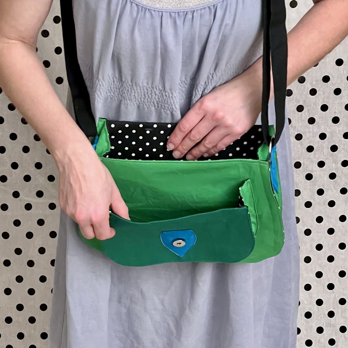Uvnitř Tě čeká černo-bílá podšívka, která je tak roztomilá, že se budeš přistihovat, jak kabelku otvíráš jen tak pro radost.
