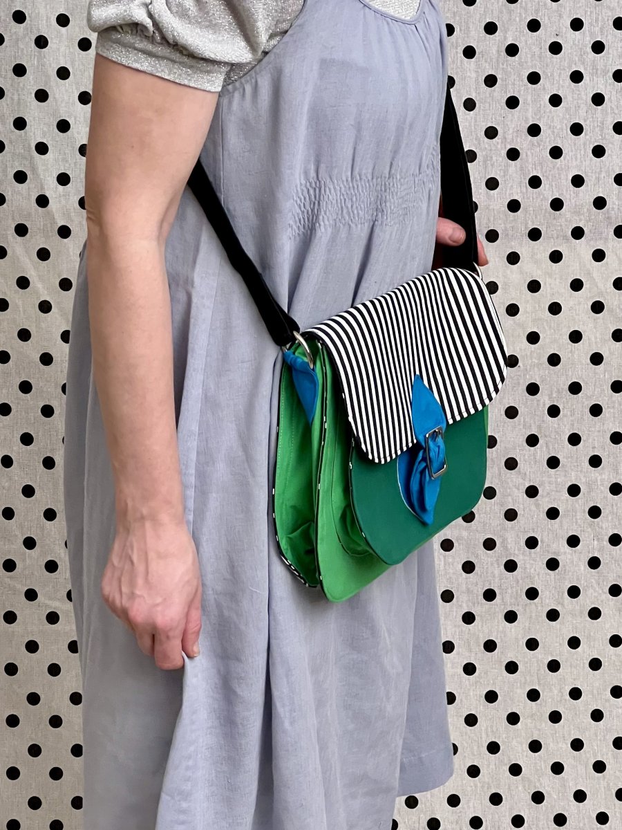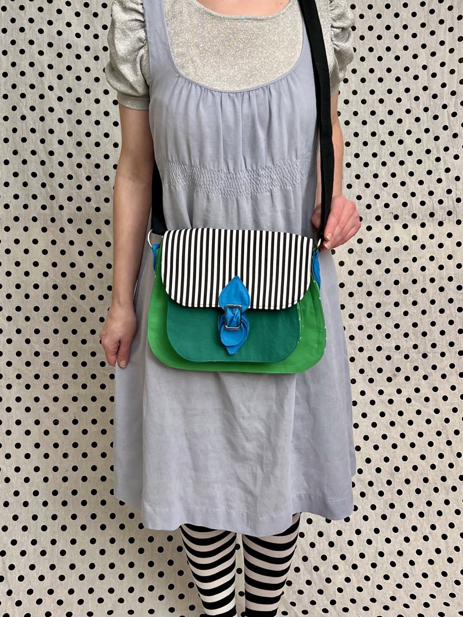 Tahle pruhovaná kabelka se zelenými kapsami bude skvělá parťačka do tvých každodenních dobrodružství.