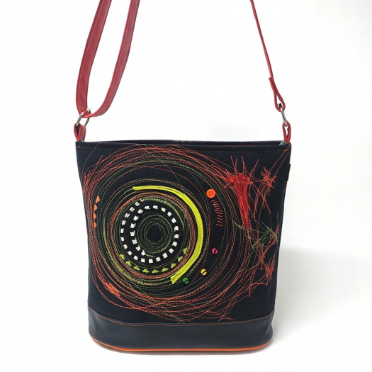 Kabelka, do ktorej sa vojde aj formát A4, je vyrobená z kvalitných poťahových materiálov (pevná textília vysokej kvlaity s jemným semišovým povrchom, koženka) je vytvorená s použitím vlastného návrhu a strihu a doplnená autorskou "strojokresbou".