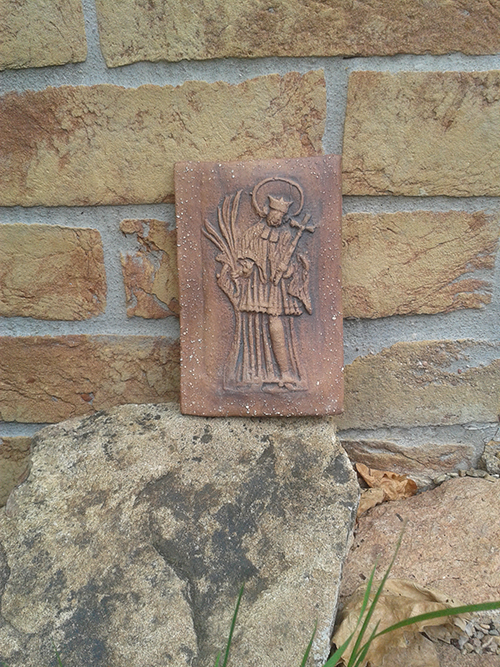 Materiál je hlína barvená oxydem železa. V nabídce jsou i jiné varianty: šamotová hlína barvená burelem nebo motiv Panny Maria coby Immaculaty a ještě pracuji na Svatém Václavovi. Velikost cca 10 x14