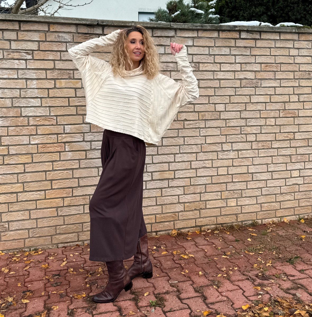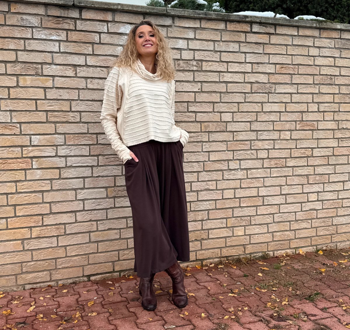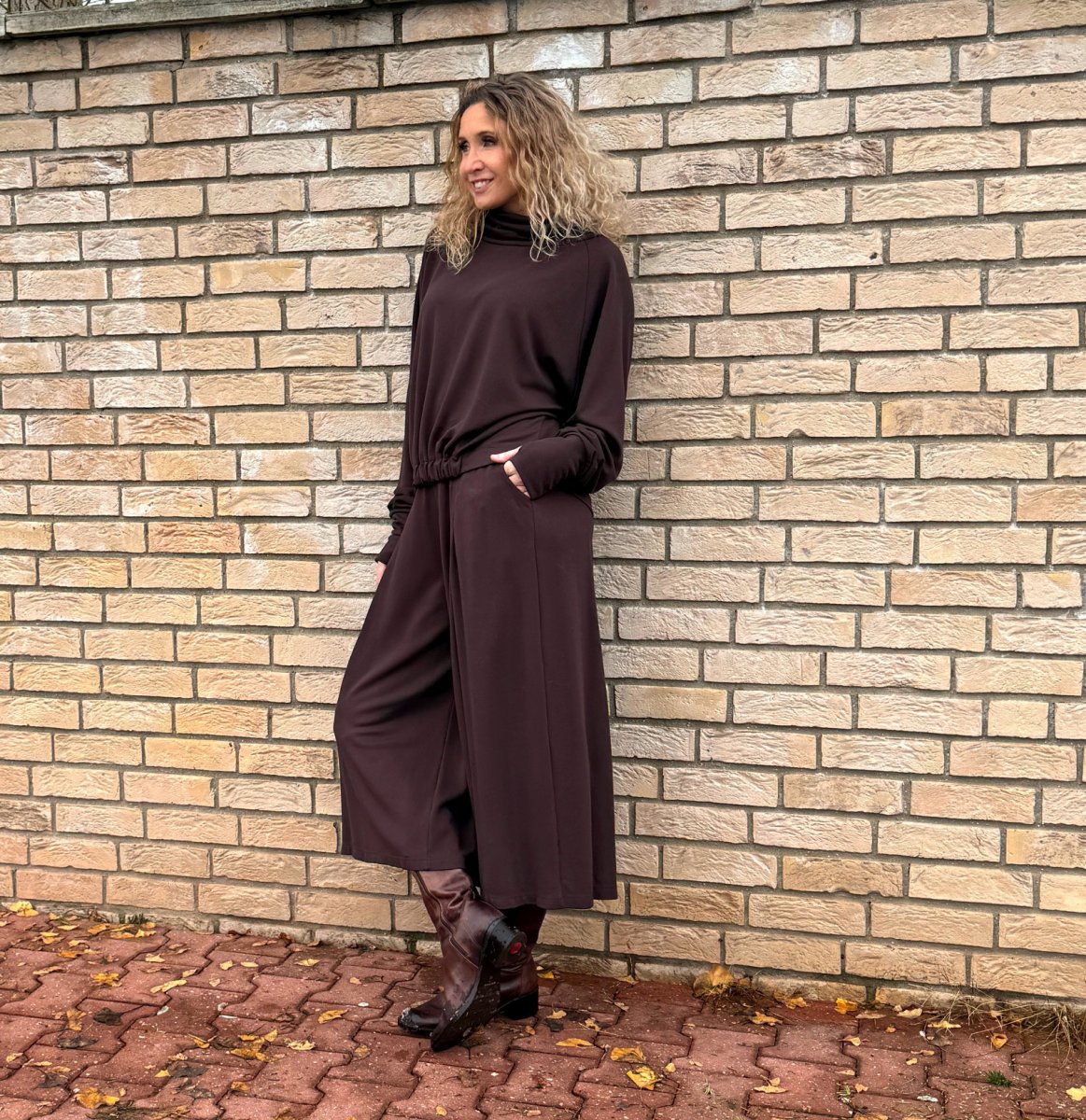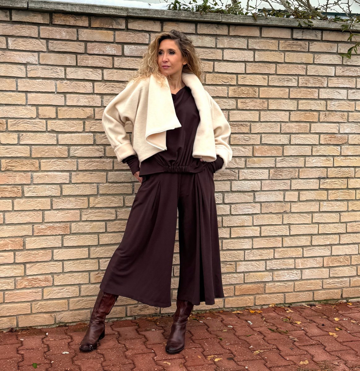 Široké kalhoty do zvonu. Na první pohled působí jako sukně. Kalhoty jsou ušité ze středního úpletu vis/pes/elast.