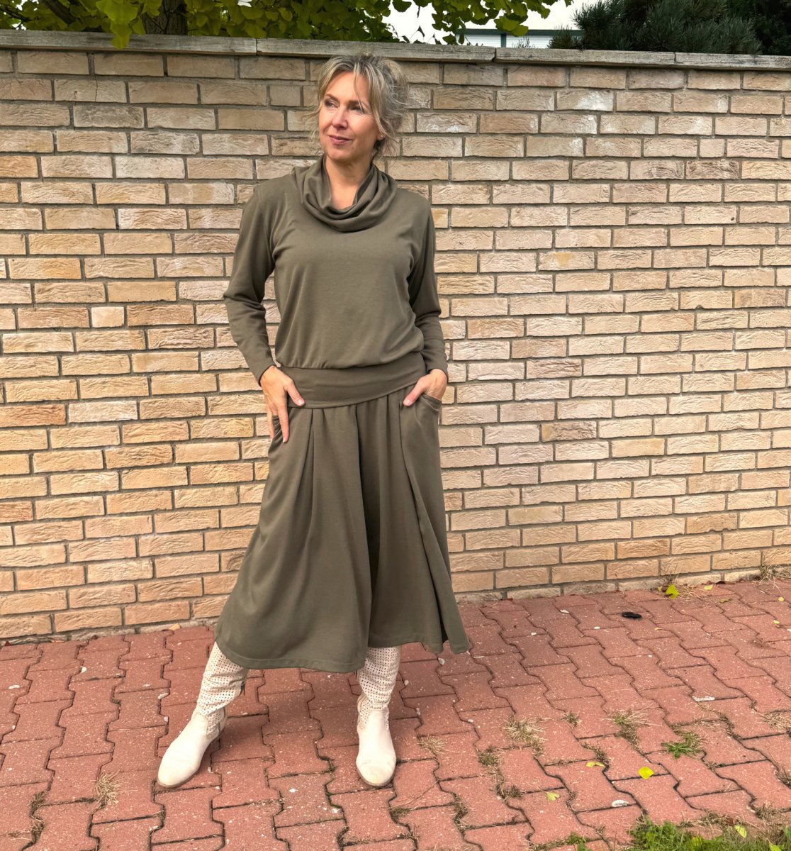 Široké kalhoty do zvonu. Na první pohled působí jako sukně. Kalhoty jsou ušité ze středního úpletu vis/pes/elast.