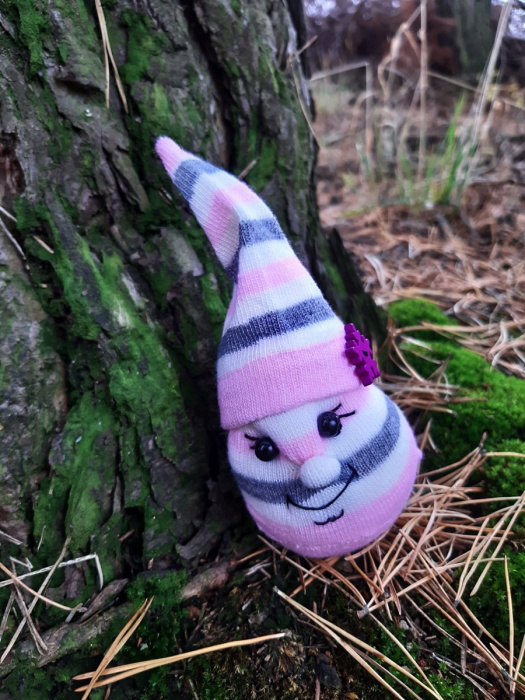 Jsem malinká kapička pro štěstí zrozená z ponožek.Narodila jsem se u jednoho malého krásného rybníčku.Tudíž jsem i pozitivně naladěná a k Vám si ponesu velkou dávku pozitivní energie.Narostla jsem na cca 7-8 cm.V mém bříšku jsou schované kamínky ,abych měla trochu stabilitu.S čepičkou jsem ještě o krapínek vyšší.