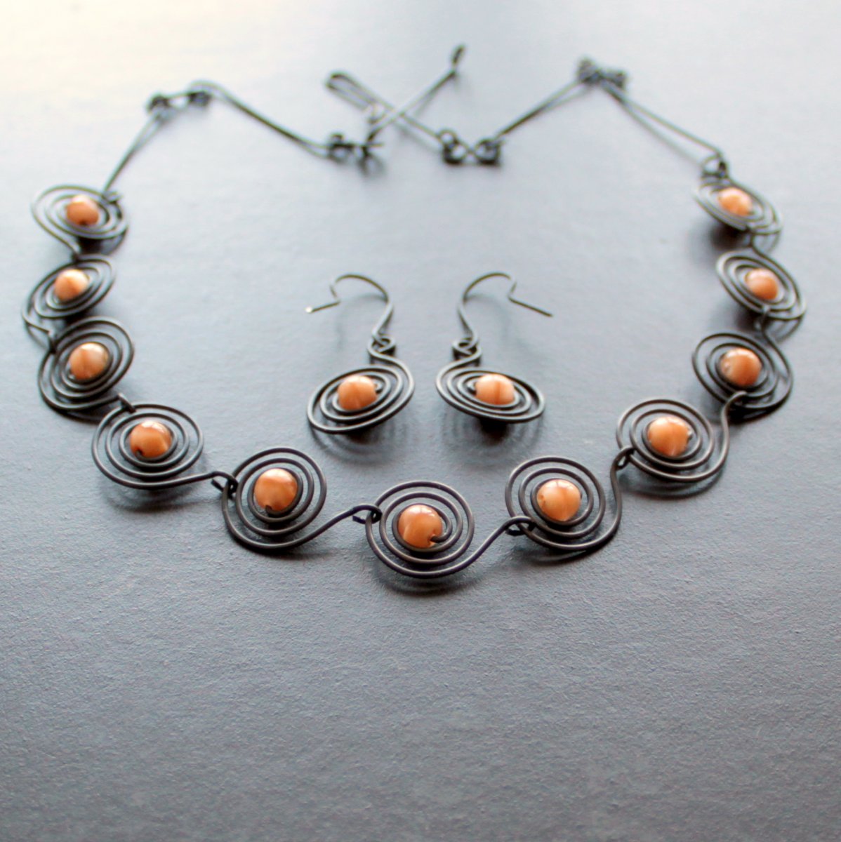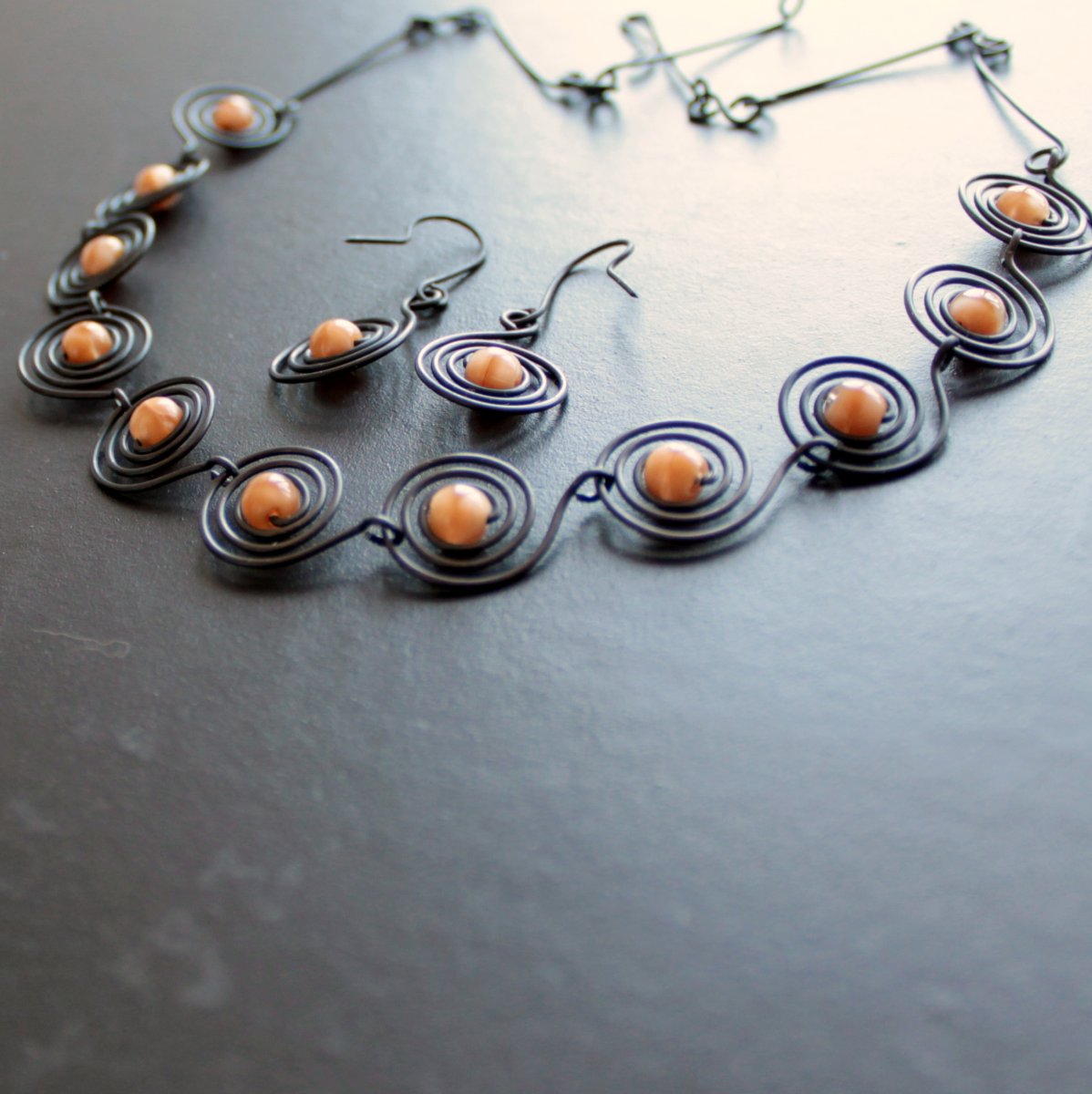 Elegantní autorský drátovaný náhrdelník z černého 1 mm drátu s béžovými kuličkami. Velikost korálku cca 0,6 cm.
