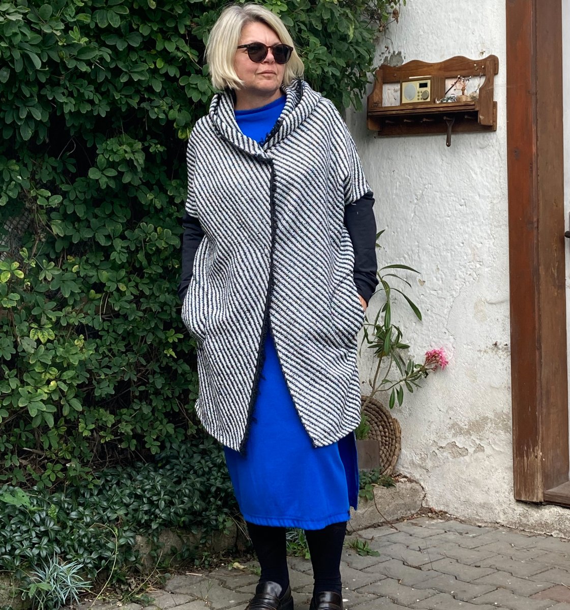 Delší kardigan z pevnější pleteniny v černobílé barevnosti.