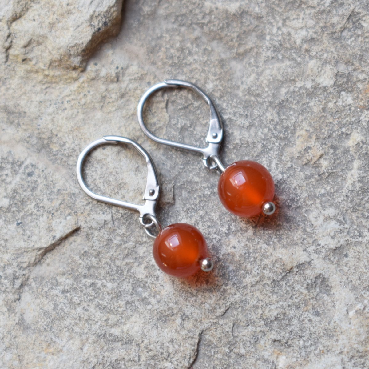 Náušnice jsou vyrobeny z karneolu a komponentů z chirurgické oceli 316 - vhodné pro alergiky.
