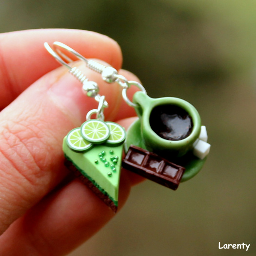 Jedna naušnice představuje hrnek plný černé kávy naservírovaný na okrasném keramickém talířku doplněný o dva cukříky se sladkou tyčinkou, druhá naušnice je citrusový dort z čokoládového korpusu doplněný o limetky s kuličkovým posypem.
