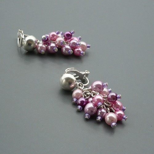 Náušnice jsou tvořeny z fialových a růžových voskovaných perliček, které jsou doplněny o drobné fialové skleněné korálky. Perličky s korálky jsou uspořádány do jemného hrozínku.