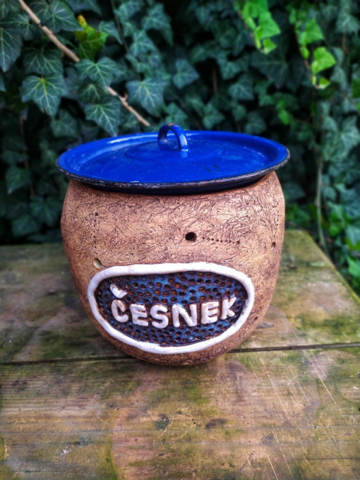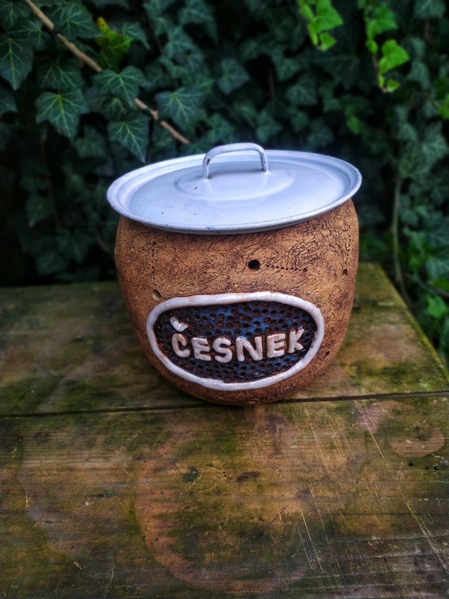 Keramická dóza na uchování česneku. Otvory na provzdušnění, v.18 x š21 cm.
