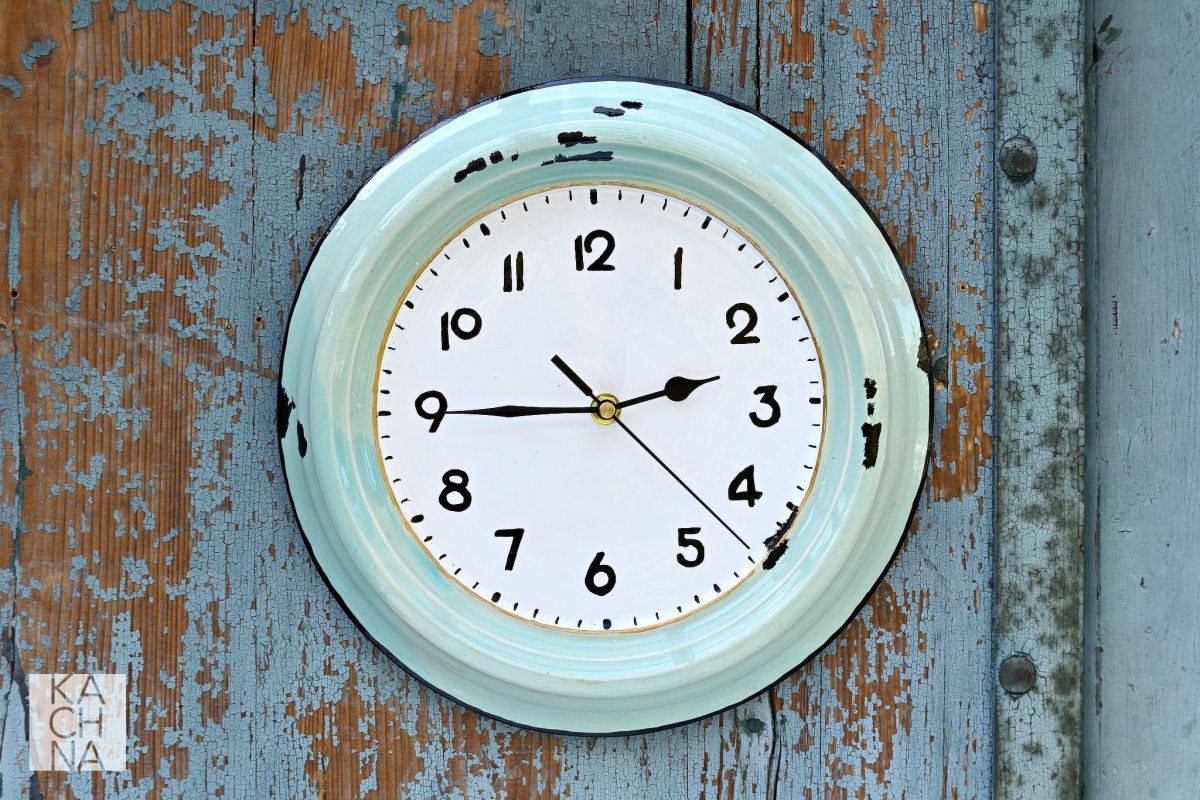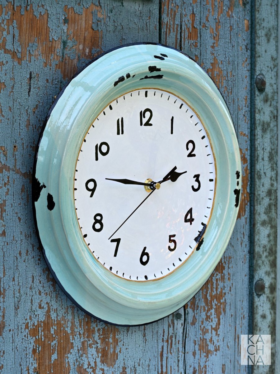 Keramické hodiny vytvořené na hrnčířském kruhu. Vintage design ve stylu smaltovaného, plechového výrobku.