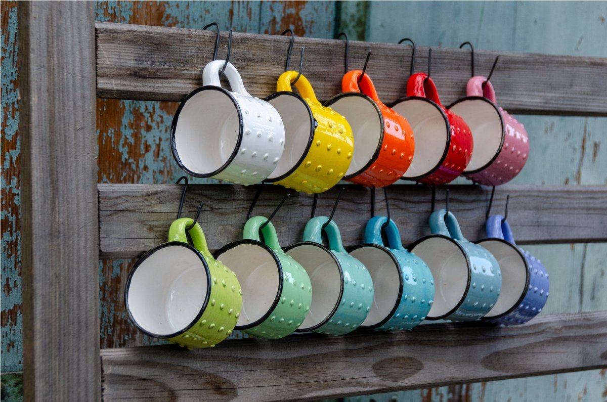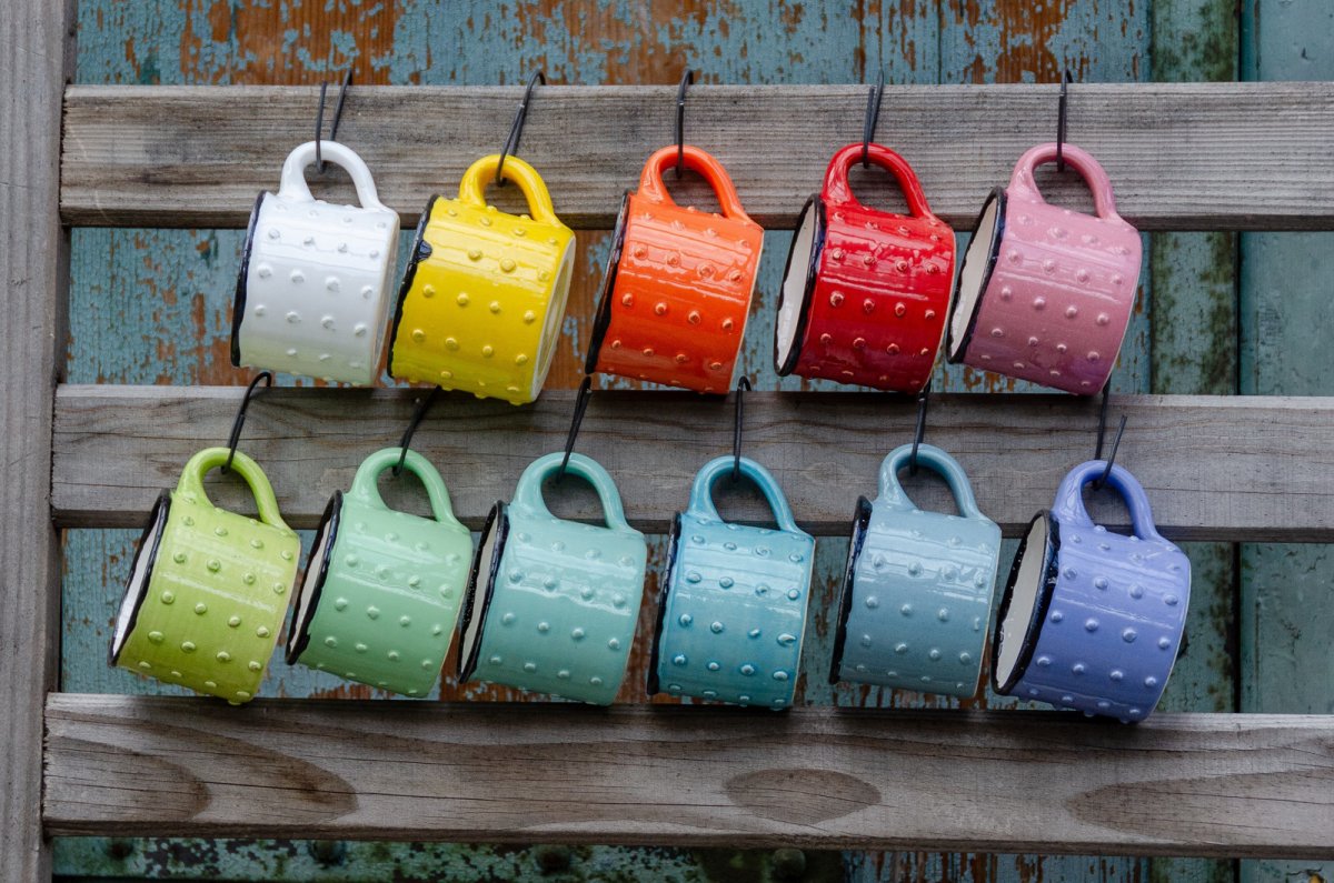 Keramický hrneček v plechovém stylu je vyrobený na hrnčířském kruhu. Uvnitř je glazován bílou glazurou. Vnější glazura v různých barvách je doplněna černou linkou a plastickými "pupínky". Všechny glazury jsou zdravotně nezávadné.