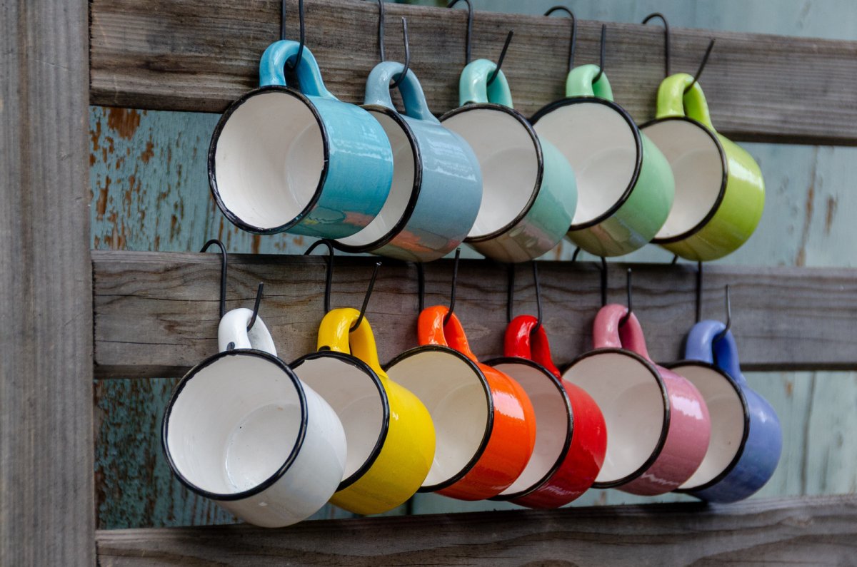 Keramický hrneček v plechovém stylu je vyrobený na hrnčířském kruhu. Uvnitř je glazován bílou glazurou. Vnější glazura v různých barvách je doplněna černou linkou. Všechny glazury jsou zdravotně nezávadné.