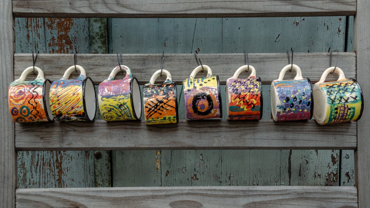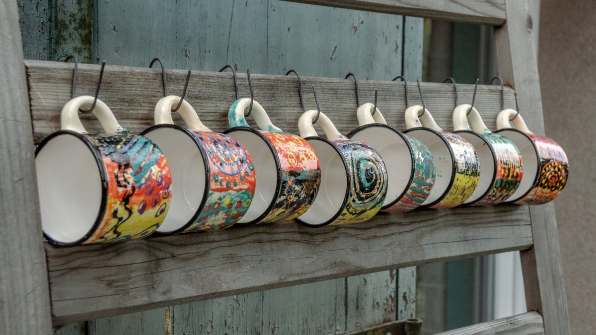 Hrnky v „plechovém" vintage designu vytvořené na hrnčířském kruhu. Vnitřní glazura bílá, vnější dekor podglazurními engobovými obtisky a transparentní glazurou.