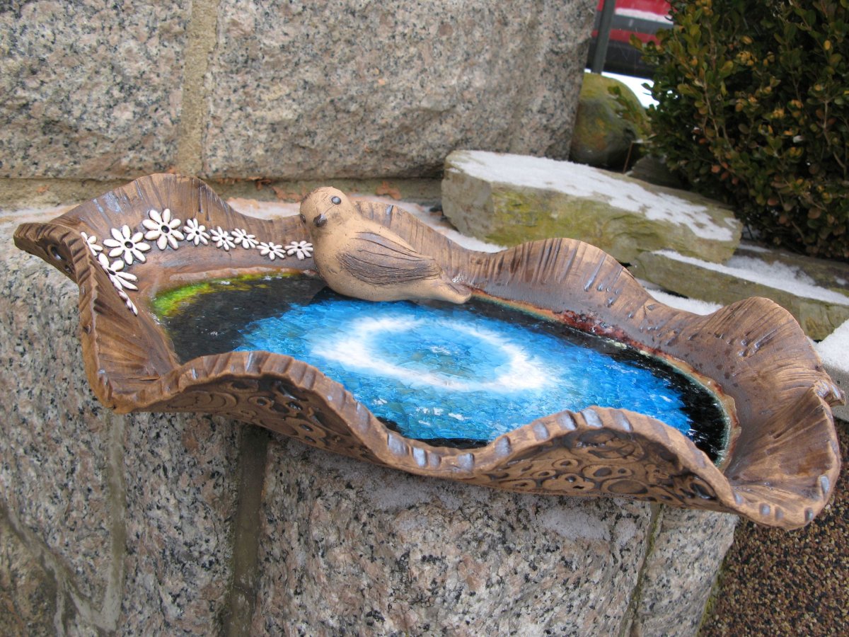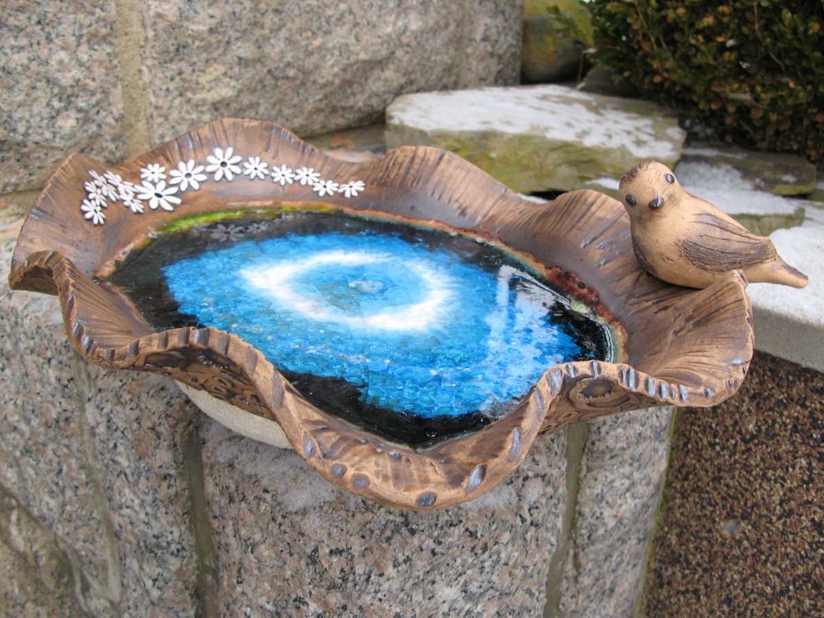 Keramický ptáček není pevně spojen s miskou, můžete ho libovolně aranžovat. Ptáčka můžete vedle pítka zapíchnou na tyčku-má zespoda dirku nebo ho použijete k jiné dekoraci.