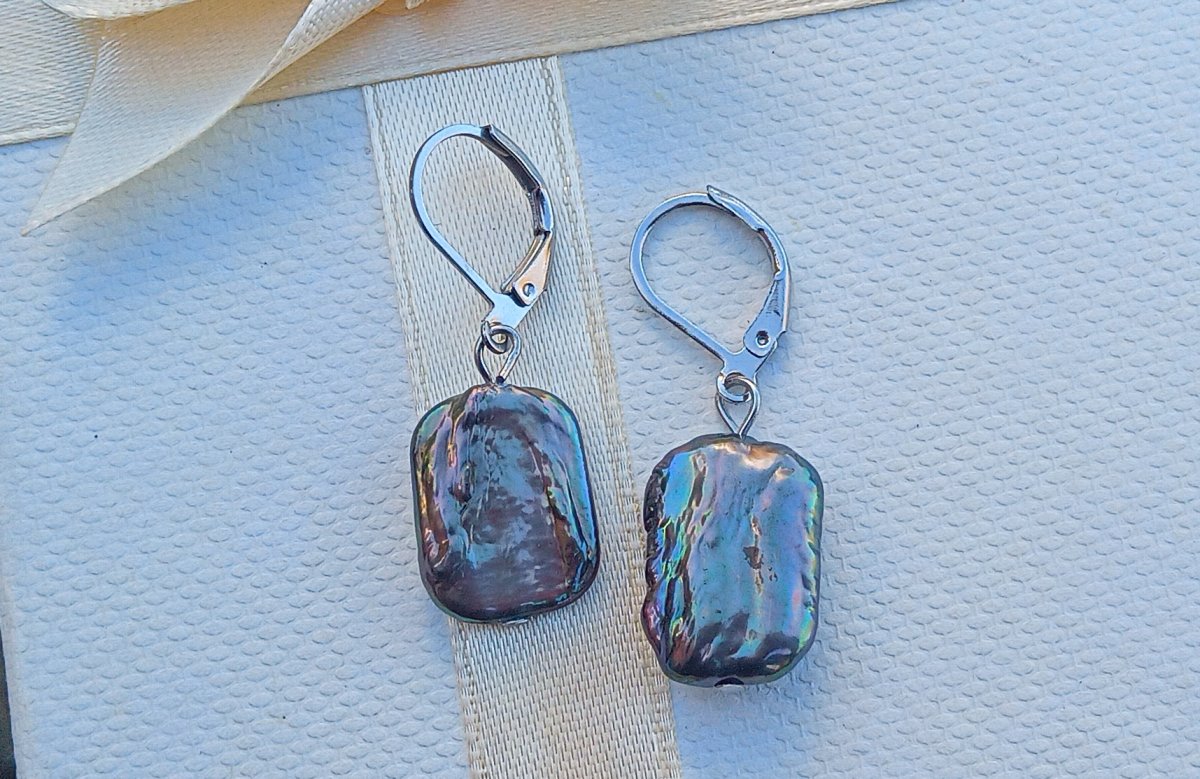 Nádherně perleťové dokonale lesklé černé mořské keshi perly v top kvalitě ve tvaru obdélníků 18x12 mm zavěšené na zavíracích háčcích z chirurgické oceli - hypoalergenní, vhodné i pro alergiky.