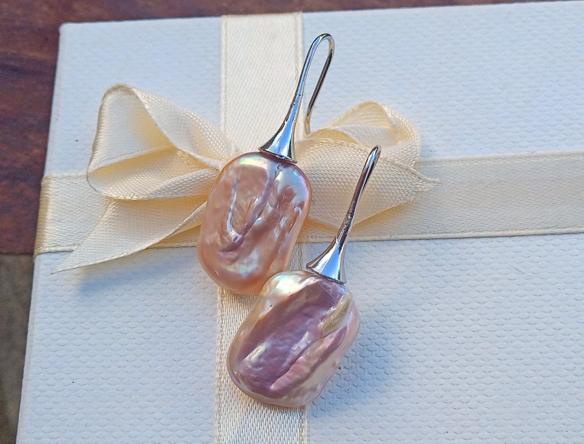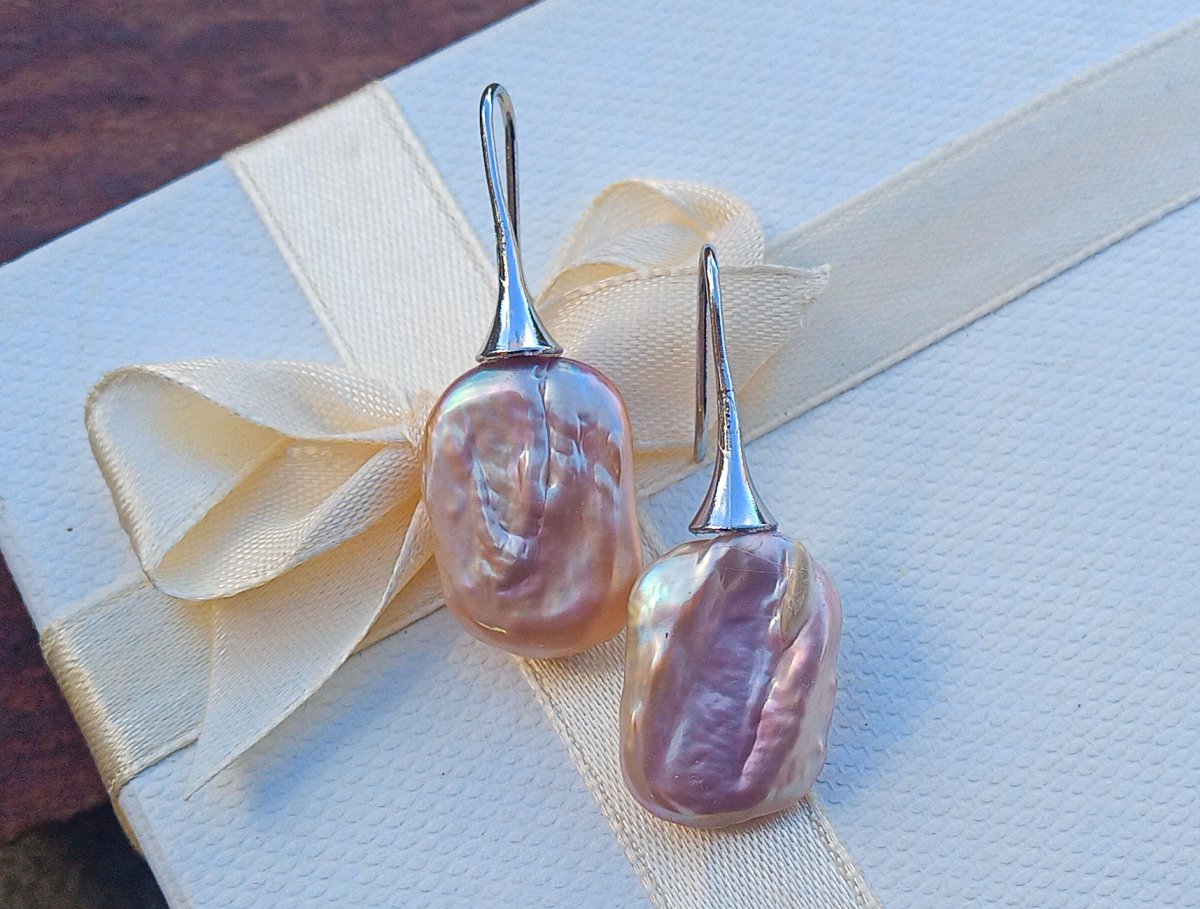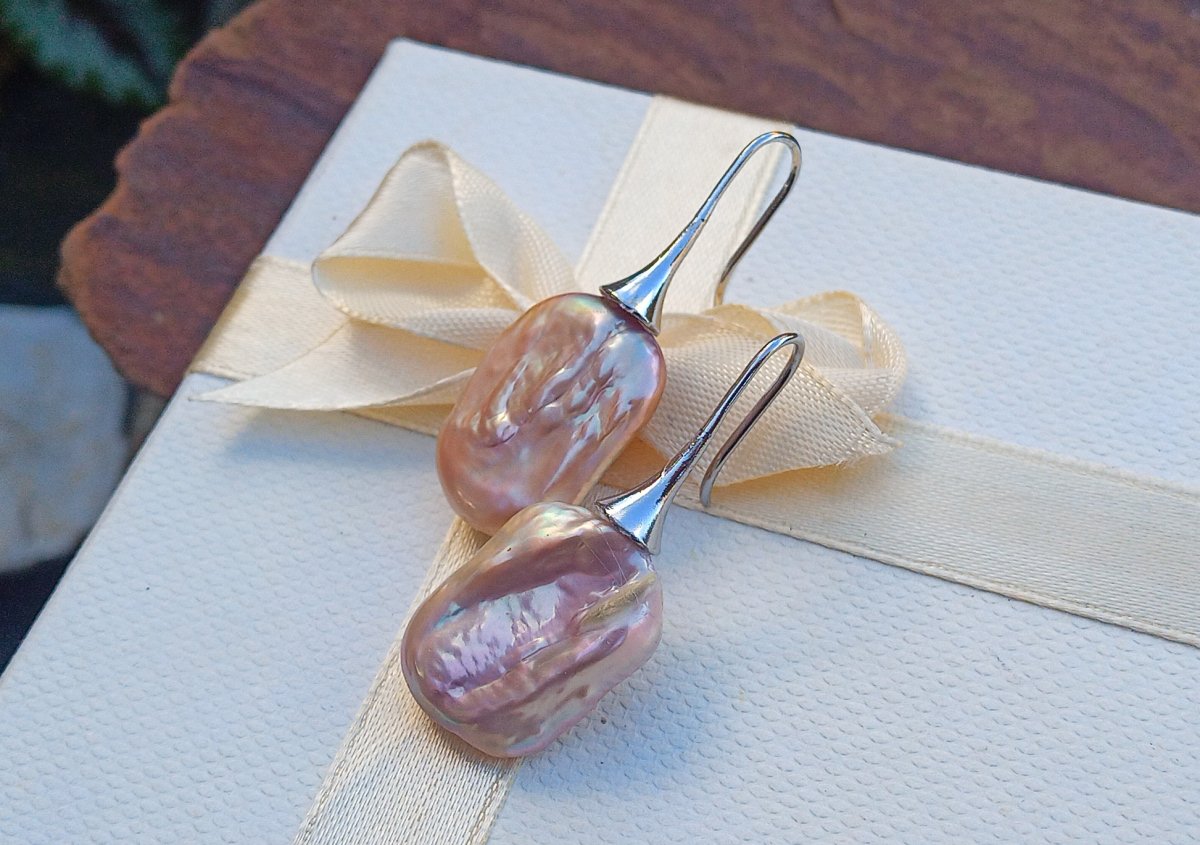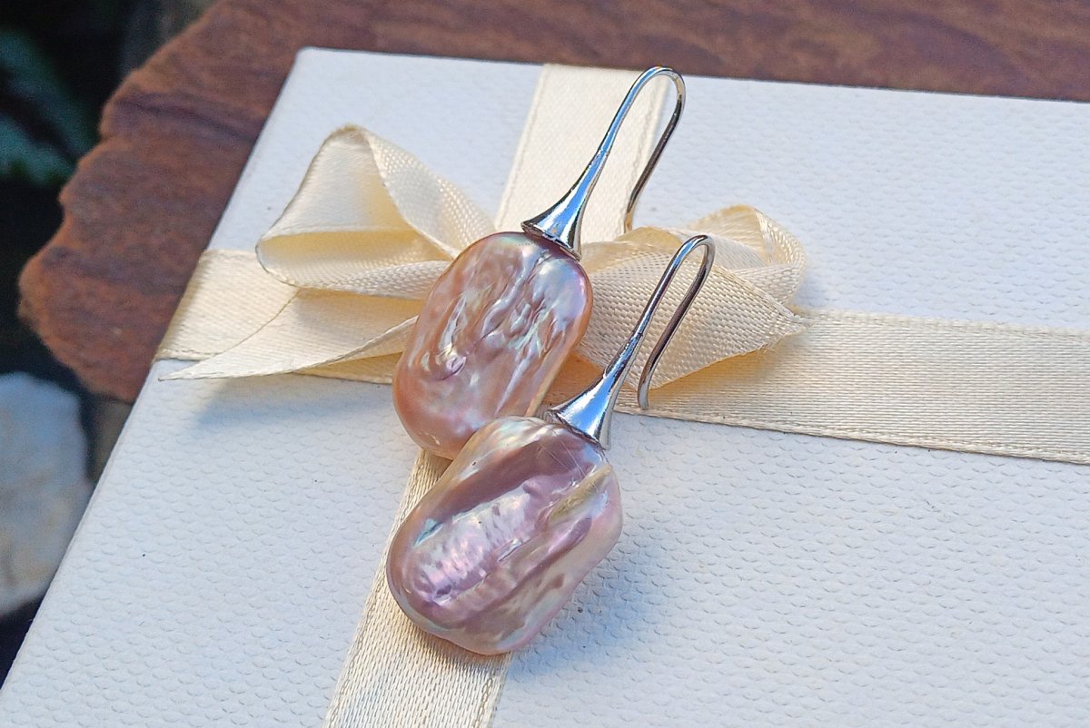 Nádherně perleťové dokonale lesklé fialkové mořské keshi perly v top kvalitě ve tvaru obdélníků 20x16 mm zavěšené na elegantních háčcích z chirurgické oceli - hypoalergenní, vhodné i pro alergiky.