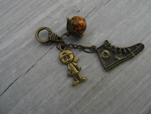 klíčenka...karabinka menší,bronzová barva,řetízek<přívěsek teniska, chlapeček,korálek,kaplík