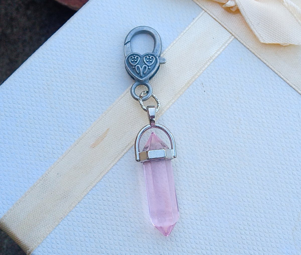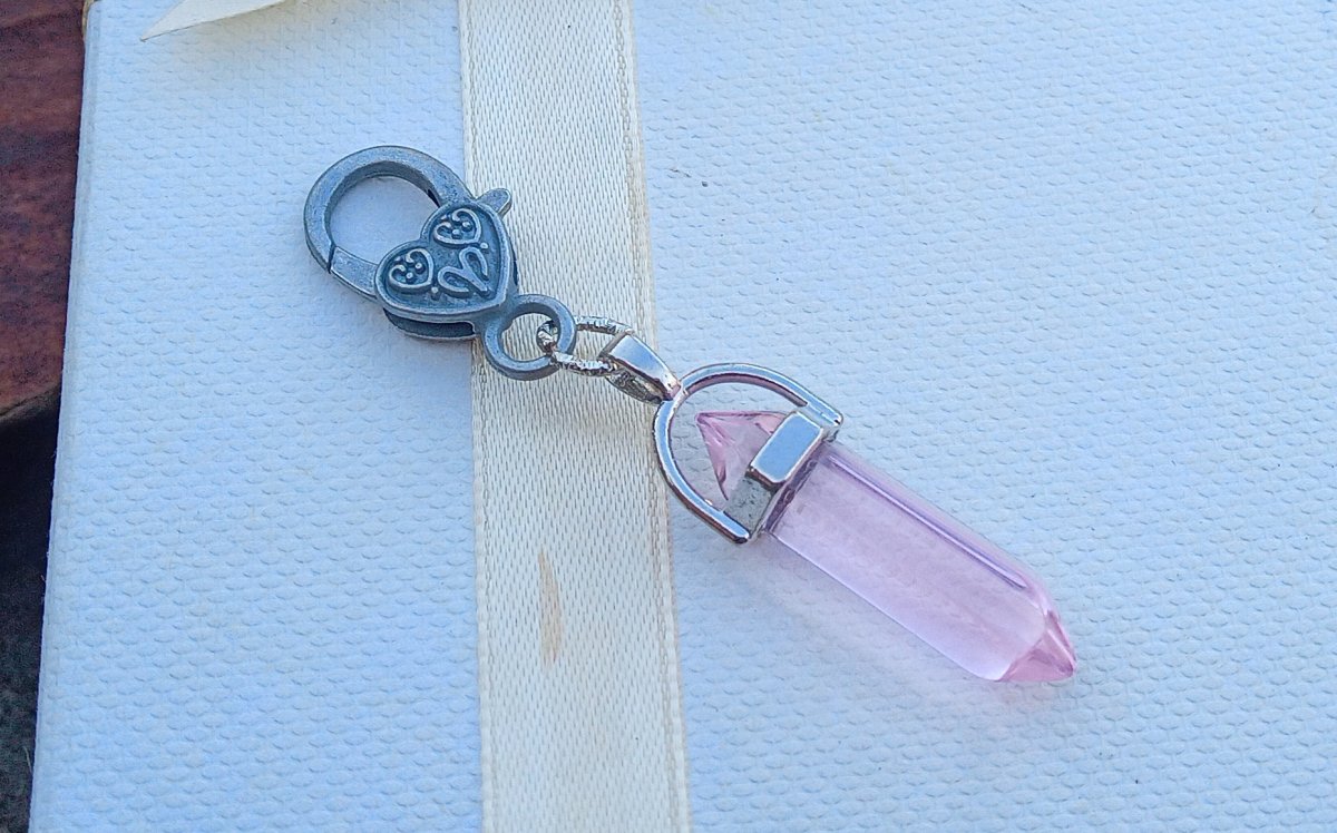 Přívěsek na klíče, nebo batoh, kabelku atd. vyrobený z růžového křišťálu zavěšeného na ozdobné karabince ve tvaru srdíčka s celkovou délkou 7 cm.