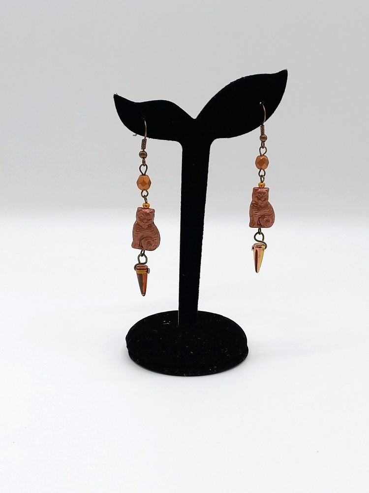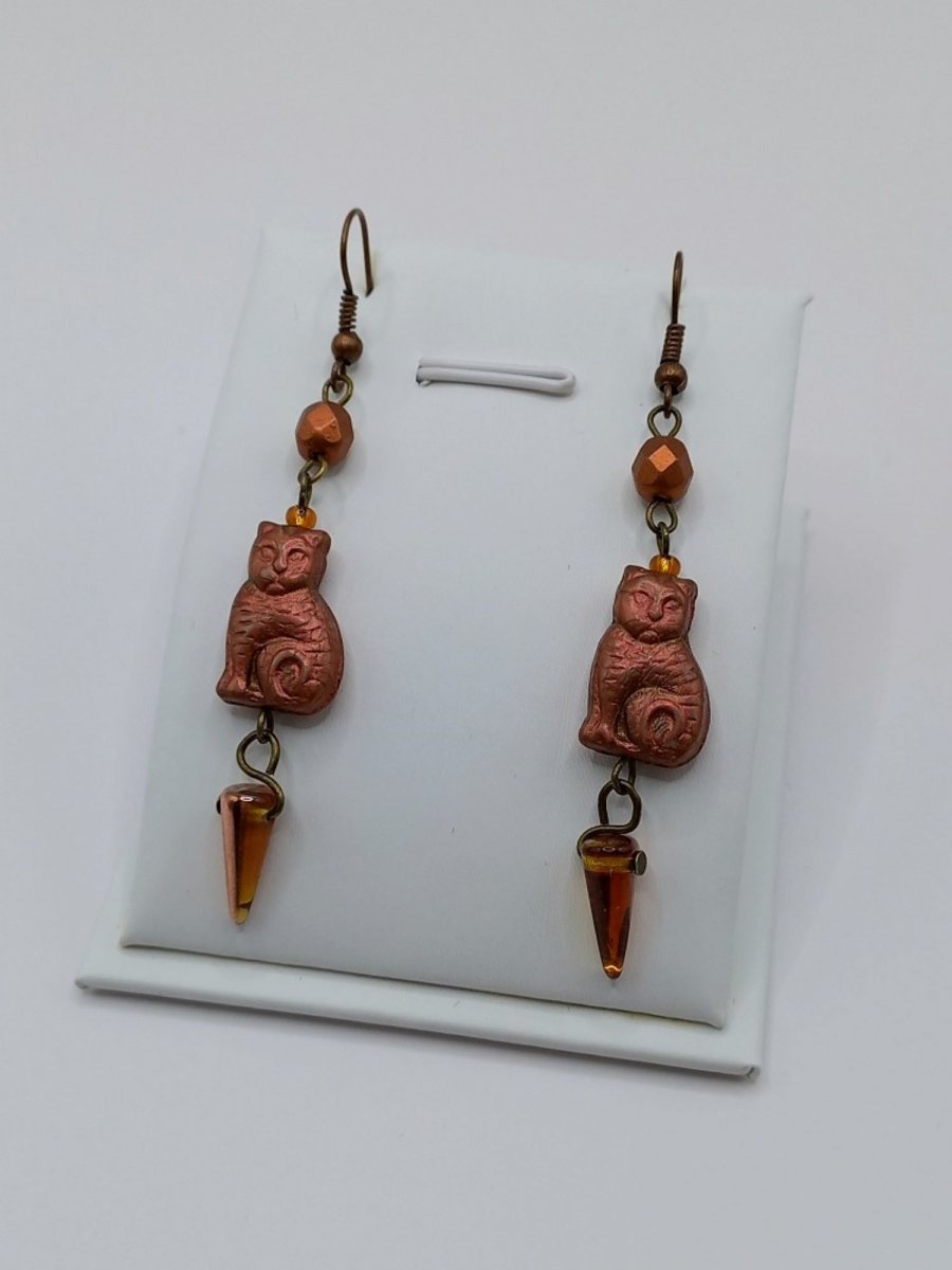 Visací náušnice s jemným kočičím motivem, ručně ketlované pro ty, kdo milují kočky a vnímají jejich tichou důstojnost. Dominantou je skleněný korálek Rutkovský ve tvaru sedící kočky – připomínající egyptskou Bastet – doplněný skleněnými korálky a zakončený korálkem Spine. Afroháček z mědi ladí s celkovou barevností v teplých měděných tónech.