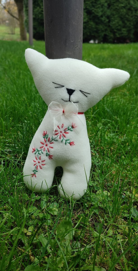 Tato originální kočička v barvě světlounce smetanové je ušitá z měkoučkého materiálu a je velmi příjemná na dotek.