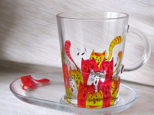 Hrnek s talířkem je malován vypalovacími barvami na sklo.