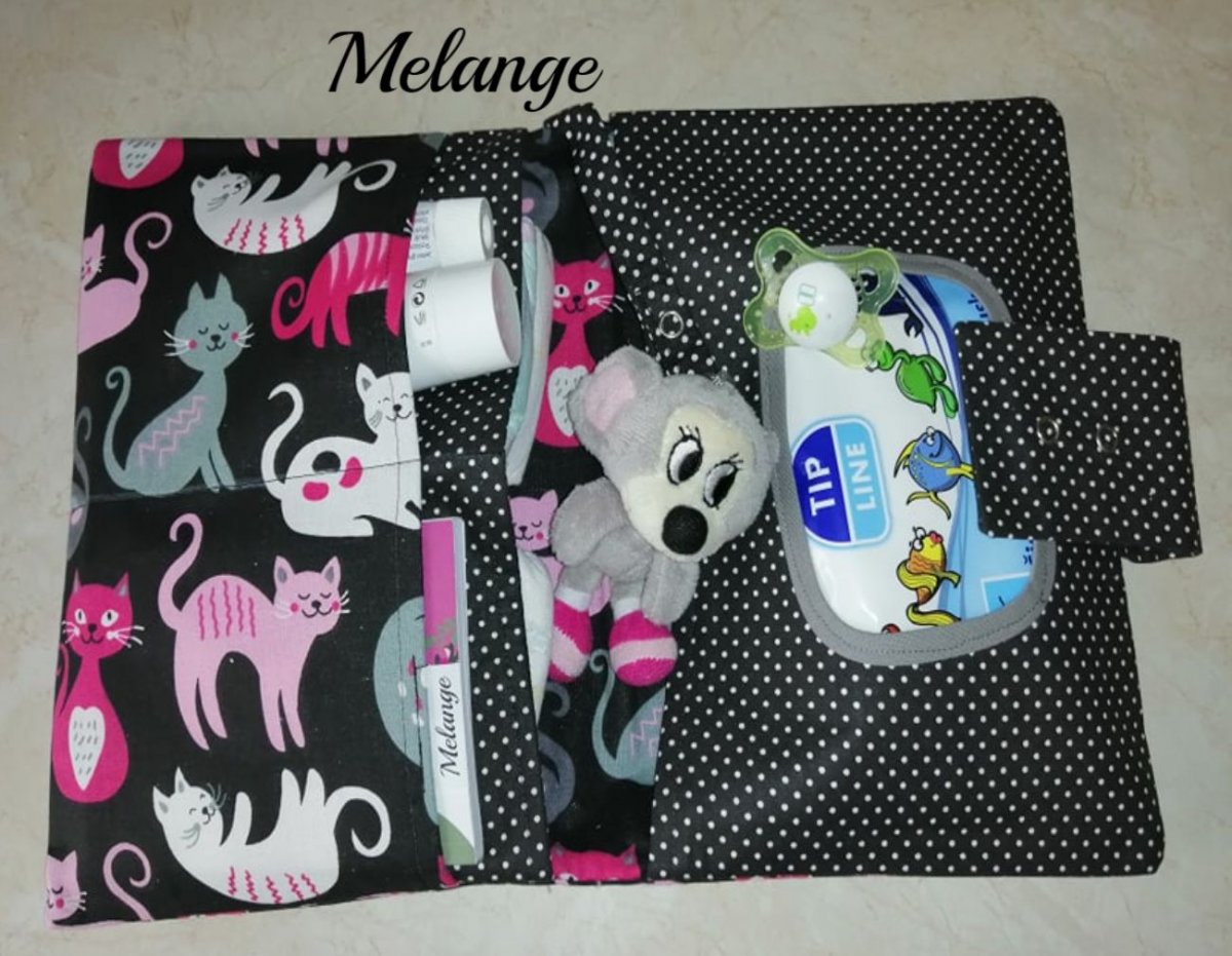 Je to velká kapsa podlepená,s kapsičkami na plenky,na vlhčené ubrousky,na krém a třeba i na mobil,poutko na dudlík nebo hračky.