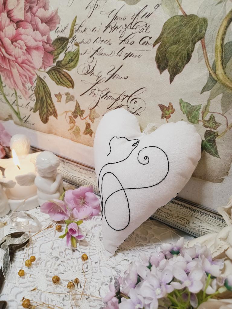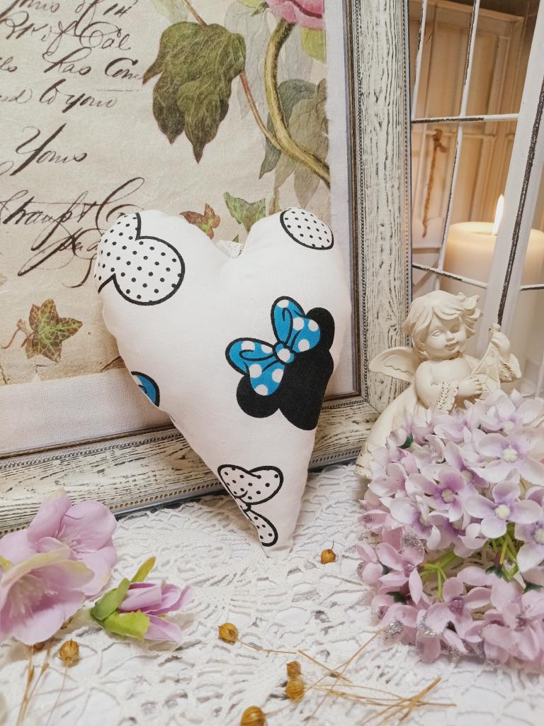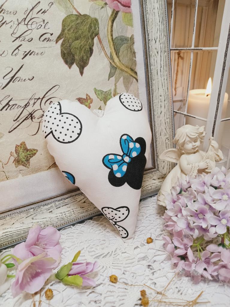 Ručně vyšívané srdíčko plněné dutým vláknem a sáčkem s levandulí. Srdíčko je dekorované jednoduchým motivem kočky a z druhé strany vzorem minnie mouse s modrou mašlí. Srdíčko je opatřené stužkou na zavěšení.