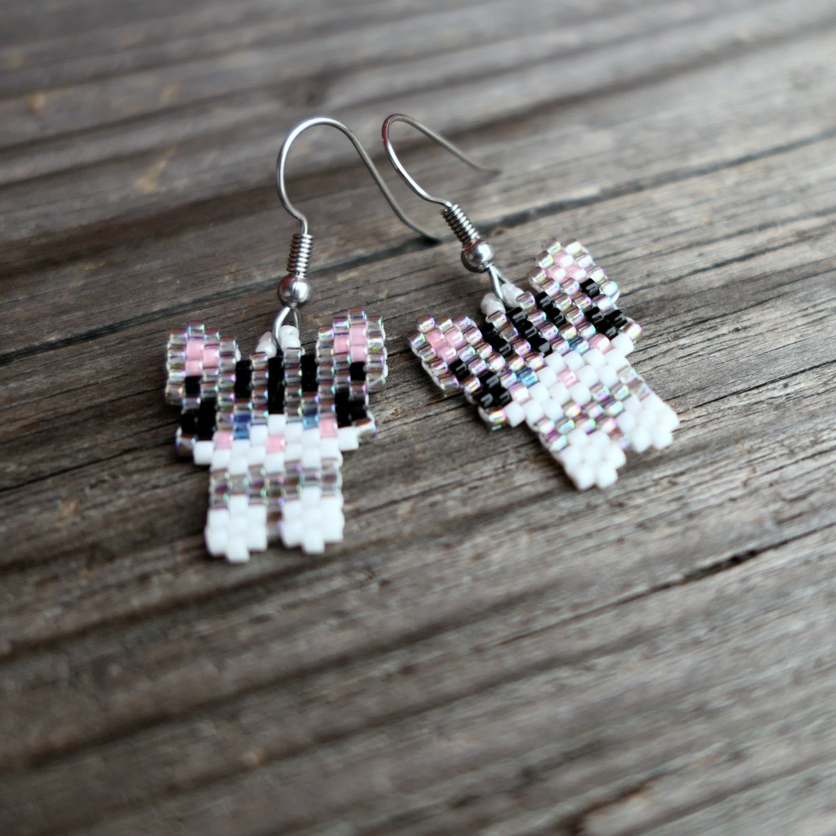 Ušito z japonského rokailu Myiuki barvy bílé, šedé s duhovým pokovem, modrá a růžová, šito nití Superlon.