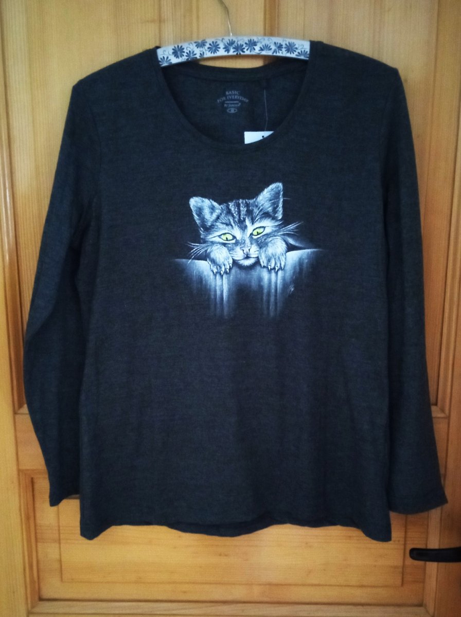 Kocourek je ručně malovaný barvou na textil a zafixovaný teplem.