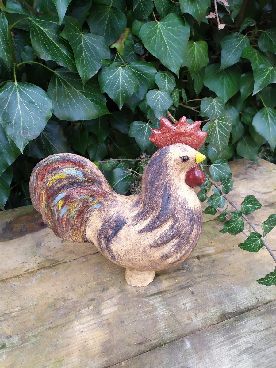 Keramický kohout z šamotové hlíny,vel.28 cm.Je možné ho nasadit na násadu nebo tyč a bude vám dělat ozdobu na zahradě.