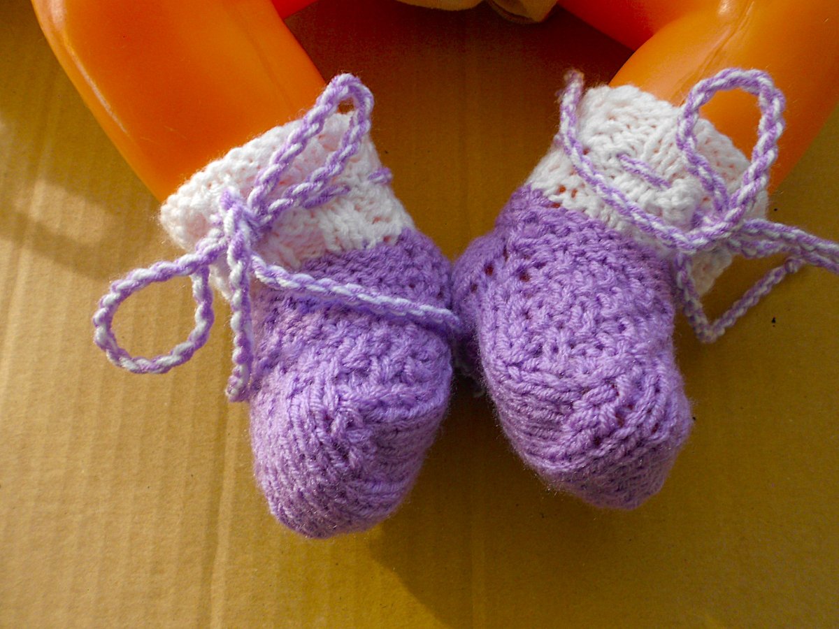 Ponožky jsou pletené na dvou jehlicích, jsou bezešvé. Zavazování na šňůrku ze stejného materiálu. Doporučuji prát ručně, nebo v pračce program na vlnu. Akryl, vhodný pro děti do 3 let.