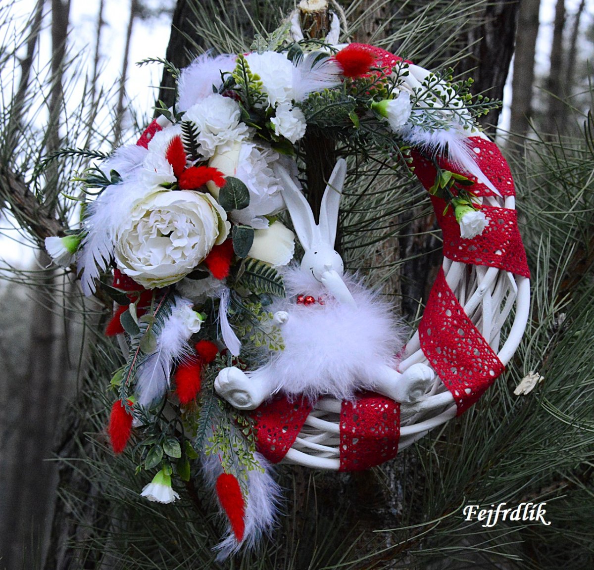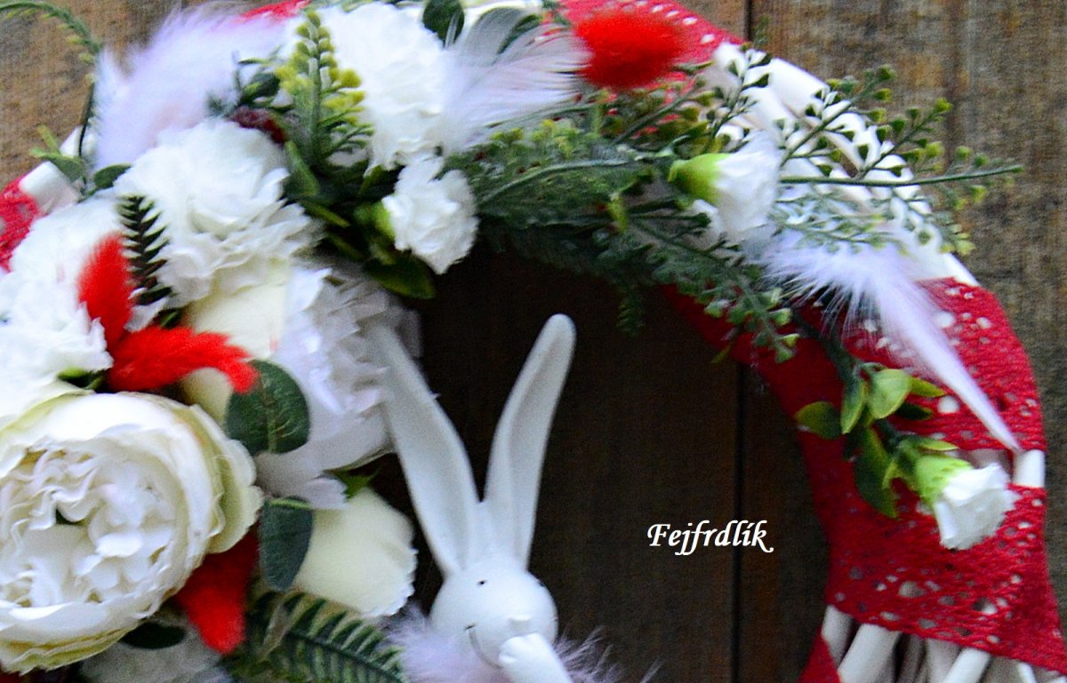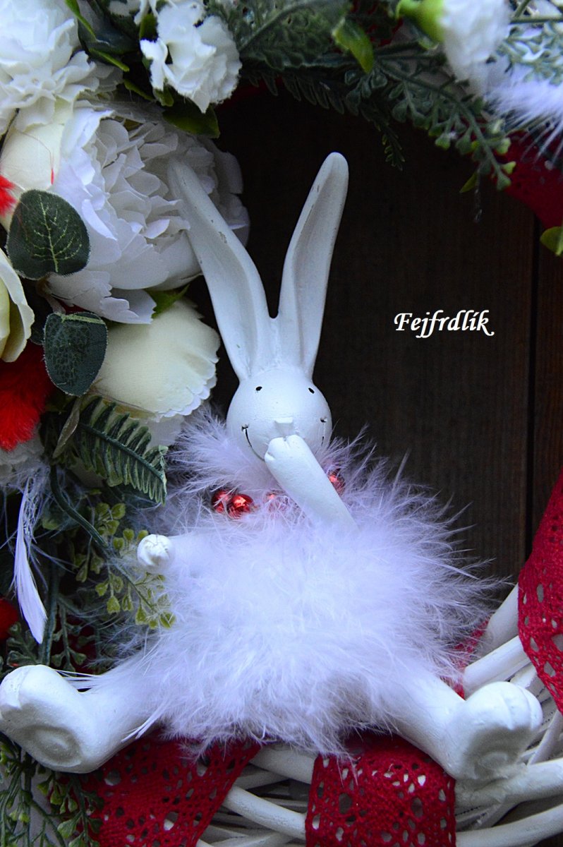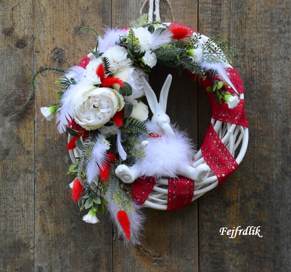 Originální jarní věnec s vtipnou zaječicí , umělými květinami , peříčky a sušinou s očkem na zavěšení.