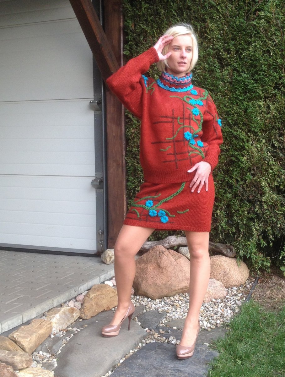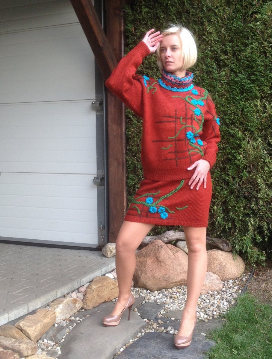 Sukně a svetřík jsou ručně upleteny ze směsové příze .