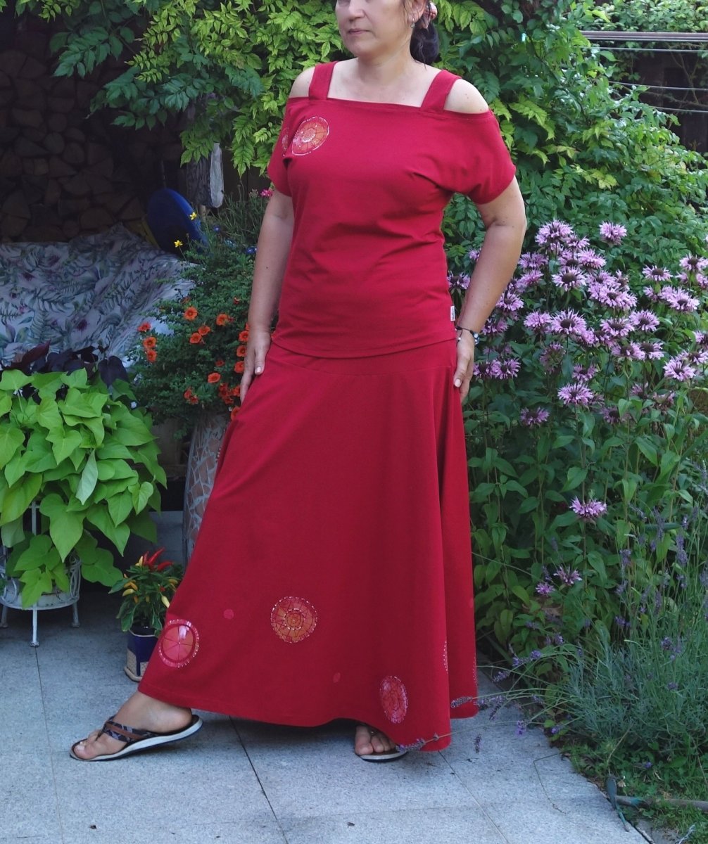 Sukně delší délky je širšího střihu, ve vrchní části má sedlo aby nedělala zbytečně objem.