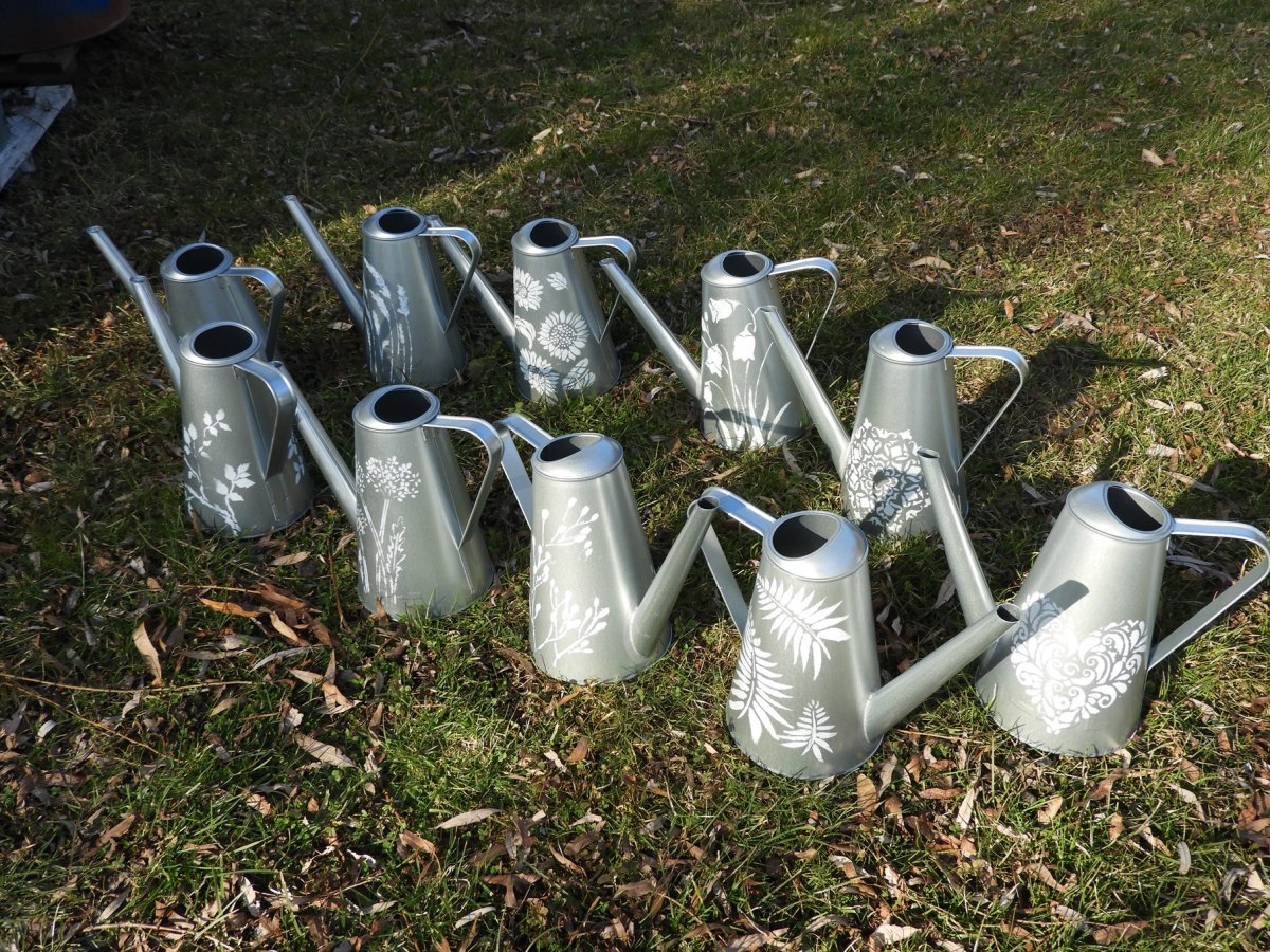 Plechová konvička o objemu 2,5litru a výška 24cm zdobená motivy v barvě bílé a stříbrné barvě plechu