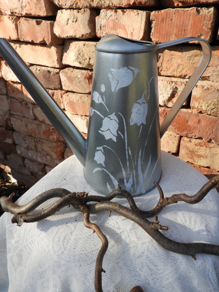 Plechová konvička o objemu 2,5litru a výška 24cm zdobená motivy v barvě bílé a stříbrné barvě plechu