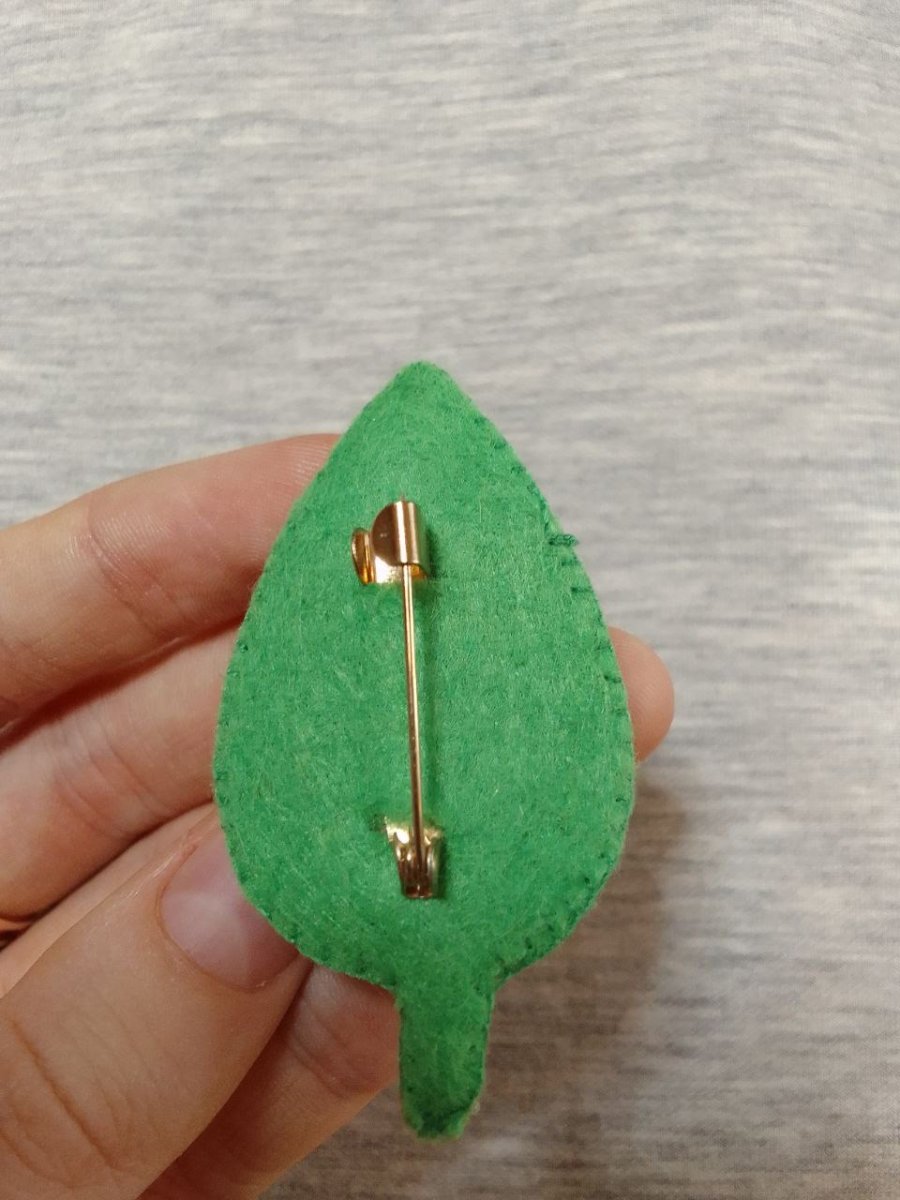 Brož vytvořená technikou korálkové výšivky. Použity jsou české skleněné korálky, francouzský drát. Jako podklad jsou dvě vrstvy plsti. Zapínání na brožový můstek. Velikost 6 x 4 cm.