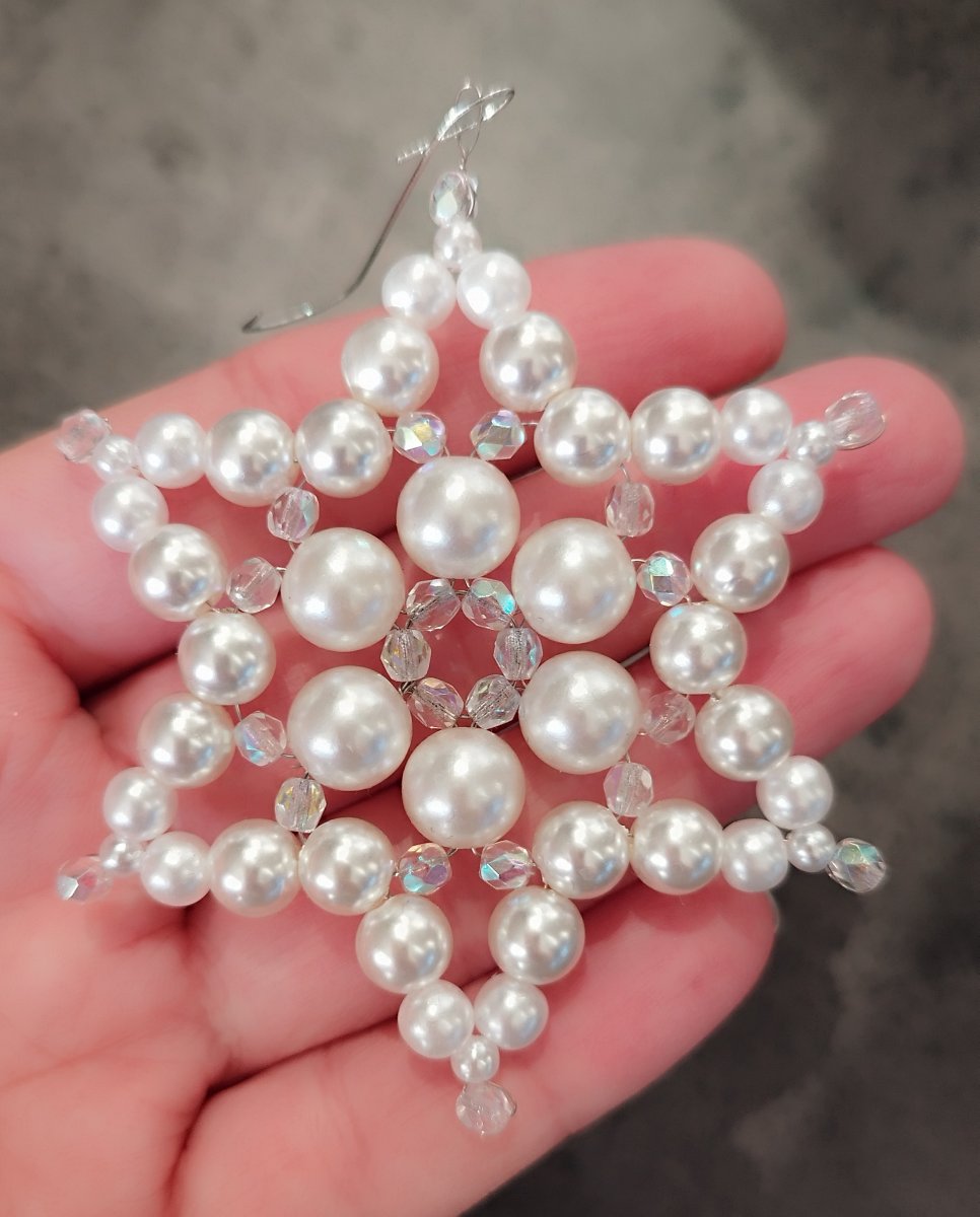 Ručně vyrobená korálková hvězdička bílé barvy s čirými krystalky. Korálky navlečeny na kovovém drátku.