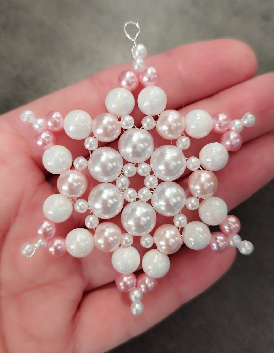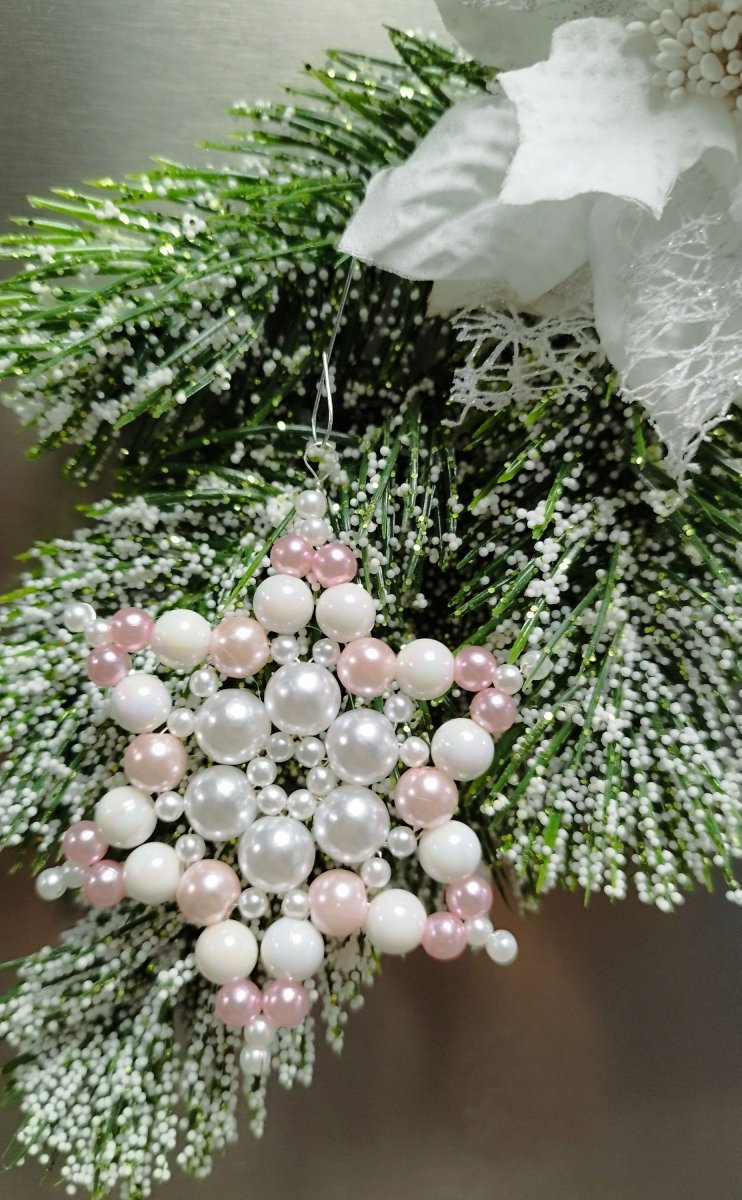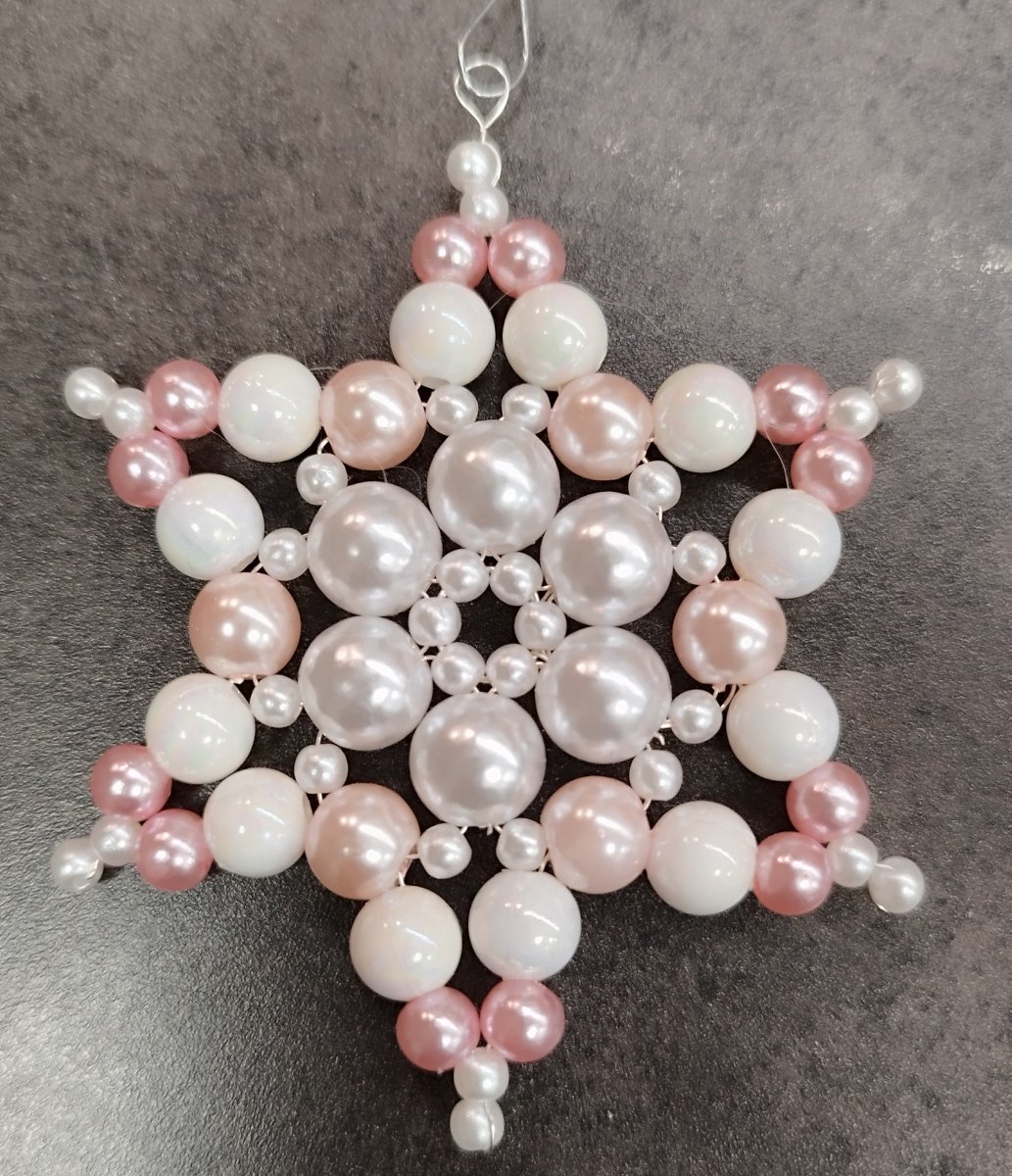 Ručně vyrobená korálková hvězdička bílorůžové barvy. Korálky navlečeny na kovovém drátku.