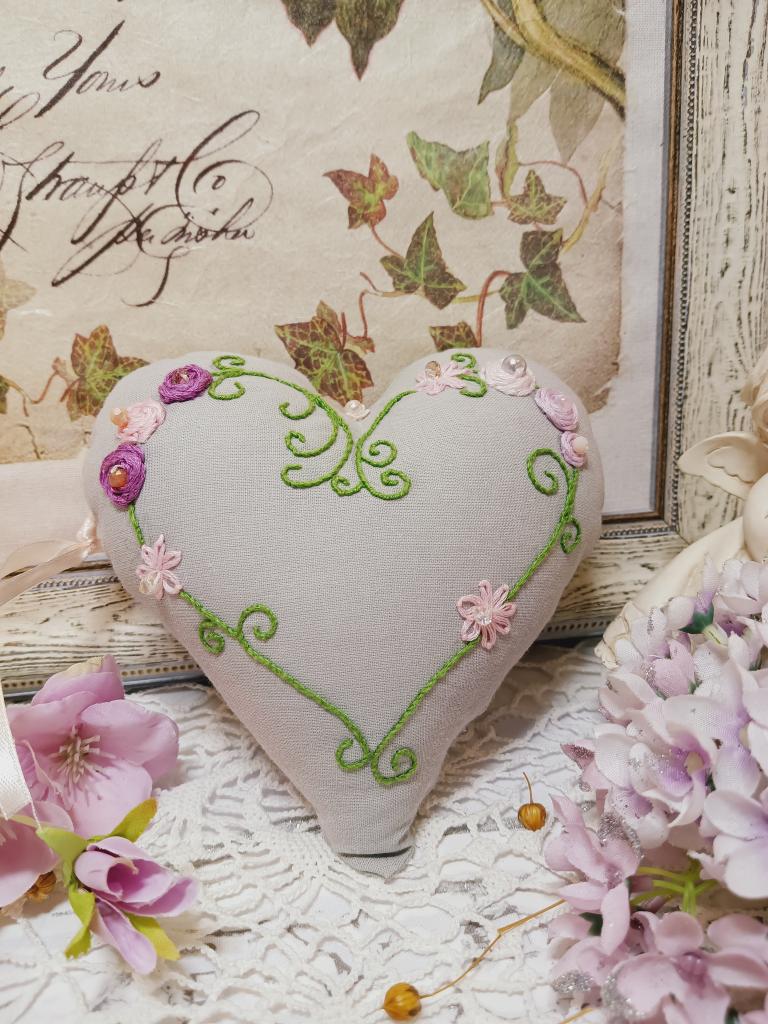 Vyšívané srdce s motivem květin, doplněné lesklými korálky. Srdíčko je v šedé barvě a je plněné dutým vláknem a levandulí. Vhodné jako dárek či pozornost. Může být jenom volně postavené nebo zavěšené, jako dekorace do věnce, nebo na noční stolek pro lepší spánek a zklidnění.