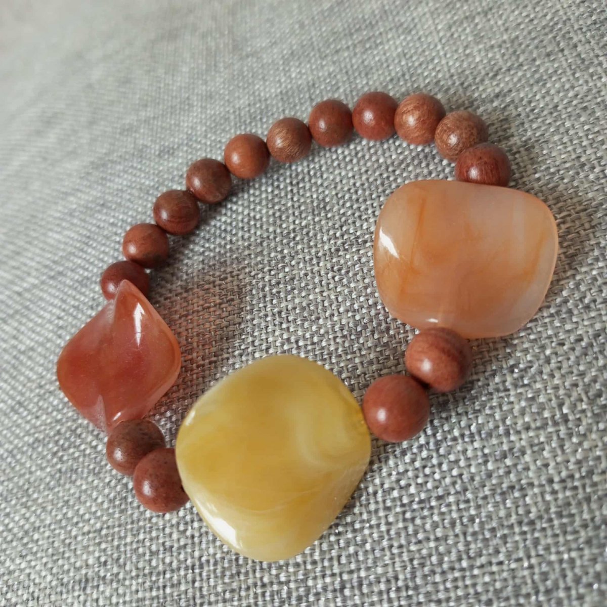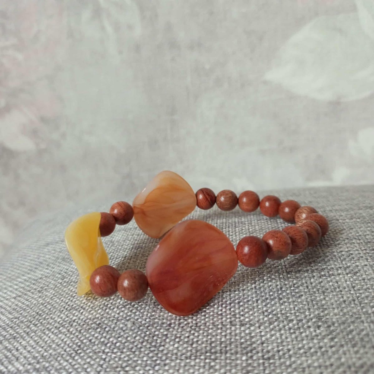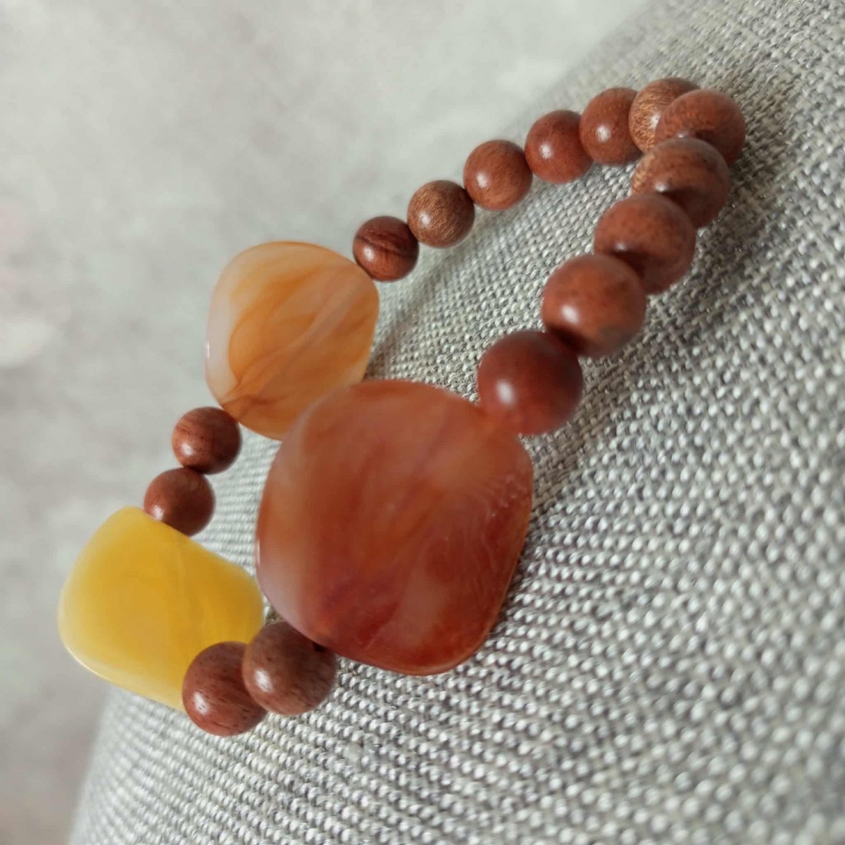 Dřevěné palisandrové korálky o velikosti 8mm s akrylovými doplňky o velkosti 20x20mm.