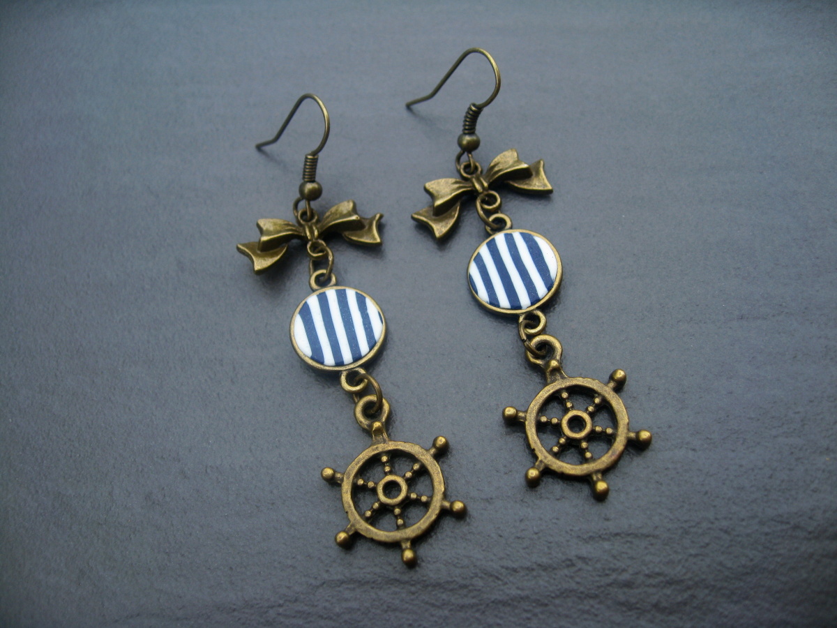 Náušnice složené z pruhovaných koleček modré a bílé barvy z polymerové hmoty Fimo, vsazených z přední strany do malých kovových lůžek, doplněné o kovové přívěsky mašliček a kormidel. Délka vč. afroháčku cca 6,5 cm. Komponenty starobronzové barvy.