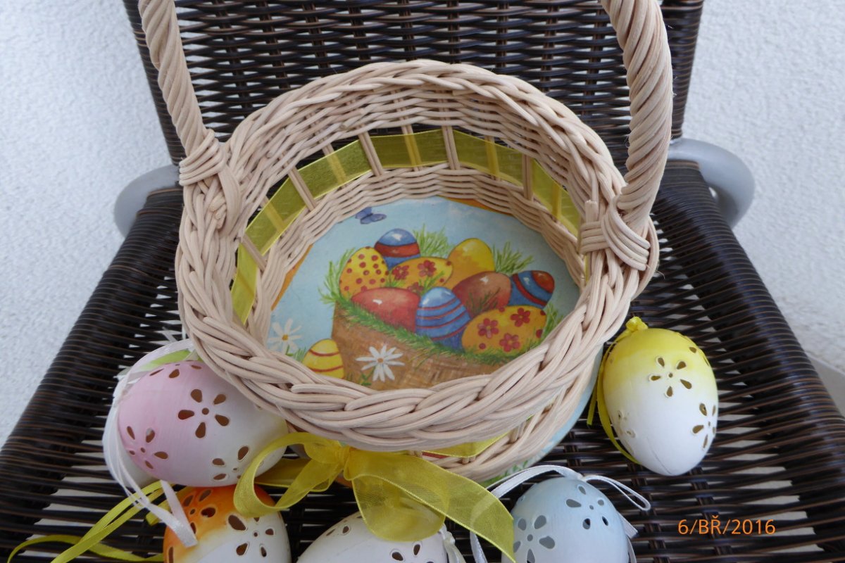 Průměr košíčku 17 cm,výška asi 22 cm.Košíček pletený z přírodního pedigu,dýnko upraveno decoupage technikou.