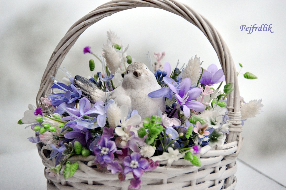 Květinová dekorace v košíčku s keramickým ptáčkem , umělými květinami a sušinou.