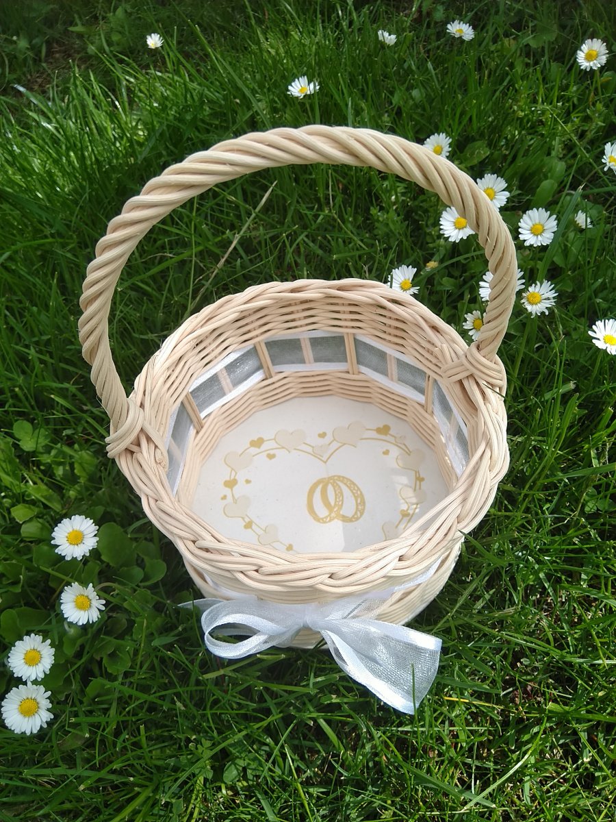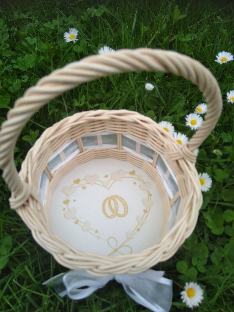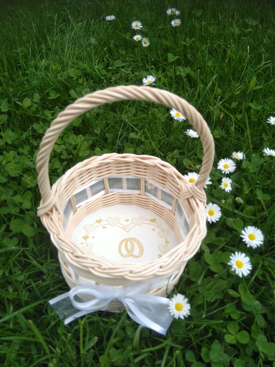 Košíček pletený z přírodního pedigu,dýnko upraveno decoupage technikou.