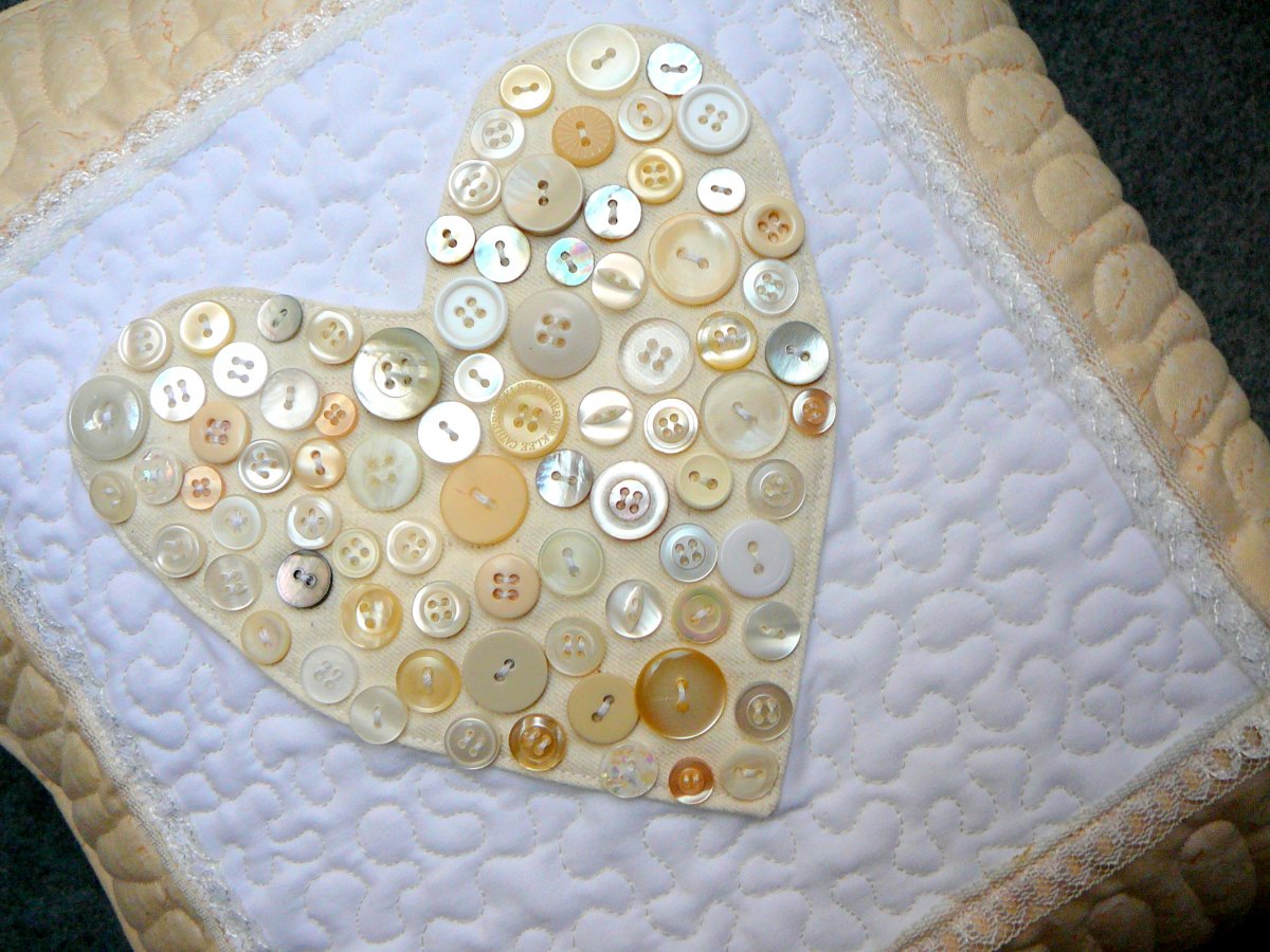 Povlak na polštář v teplých béžových tónech potěší oči a zaručí jemnou a romantickou náladu. Aplikace srdíčko dekorované spoustu knoflíku + krajka.