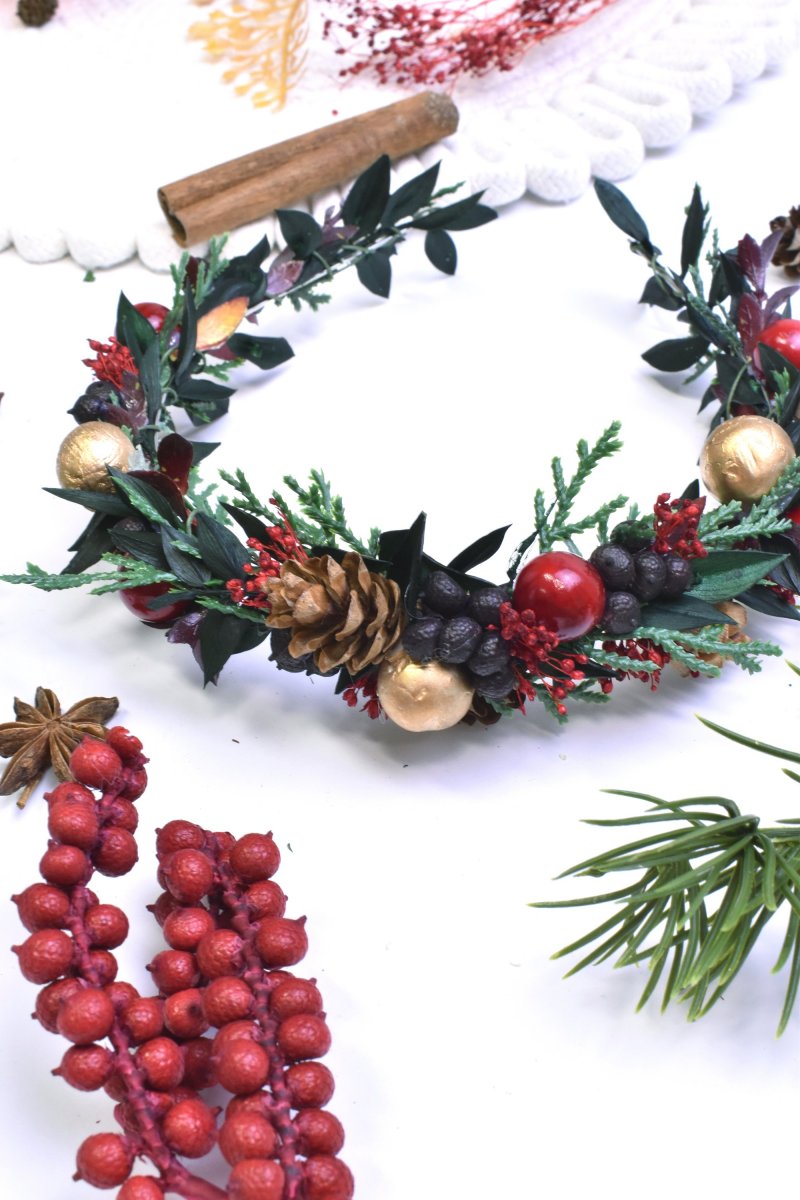 Kovová čelenka / korunka je po celém svém obvodu ozdobena sušenými i umělými lístky, šištičkami a bobulkami. Přinese Vám adventní atmosféru a doladí Váš vánoční outfit.
