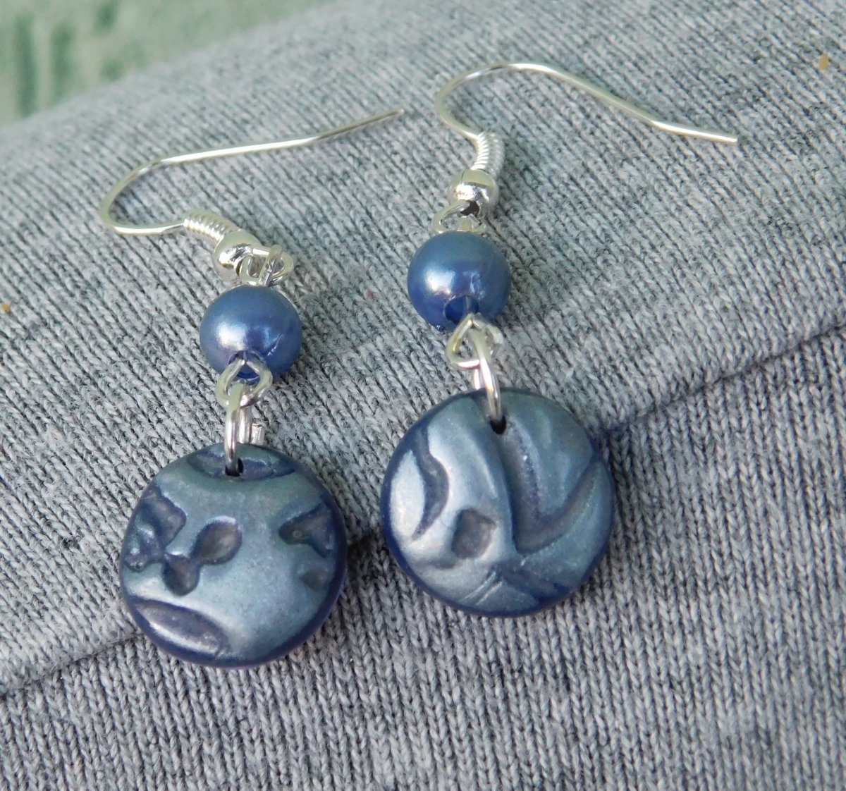 fimo kolečka doplněné modrým korálkem, délka náušnice bez háčku je cca 2,5 cm, fimo kolečka jsou lakované, zadní strana je růžová
