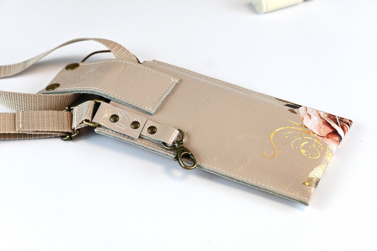 Kožená crossbody- pouzdro na mobil z nádherné béžové hovězí kůže v lakované úpravě a mačkaném vzhledu s růží
