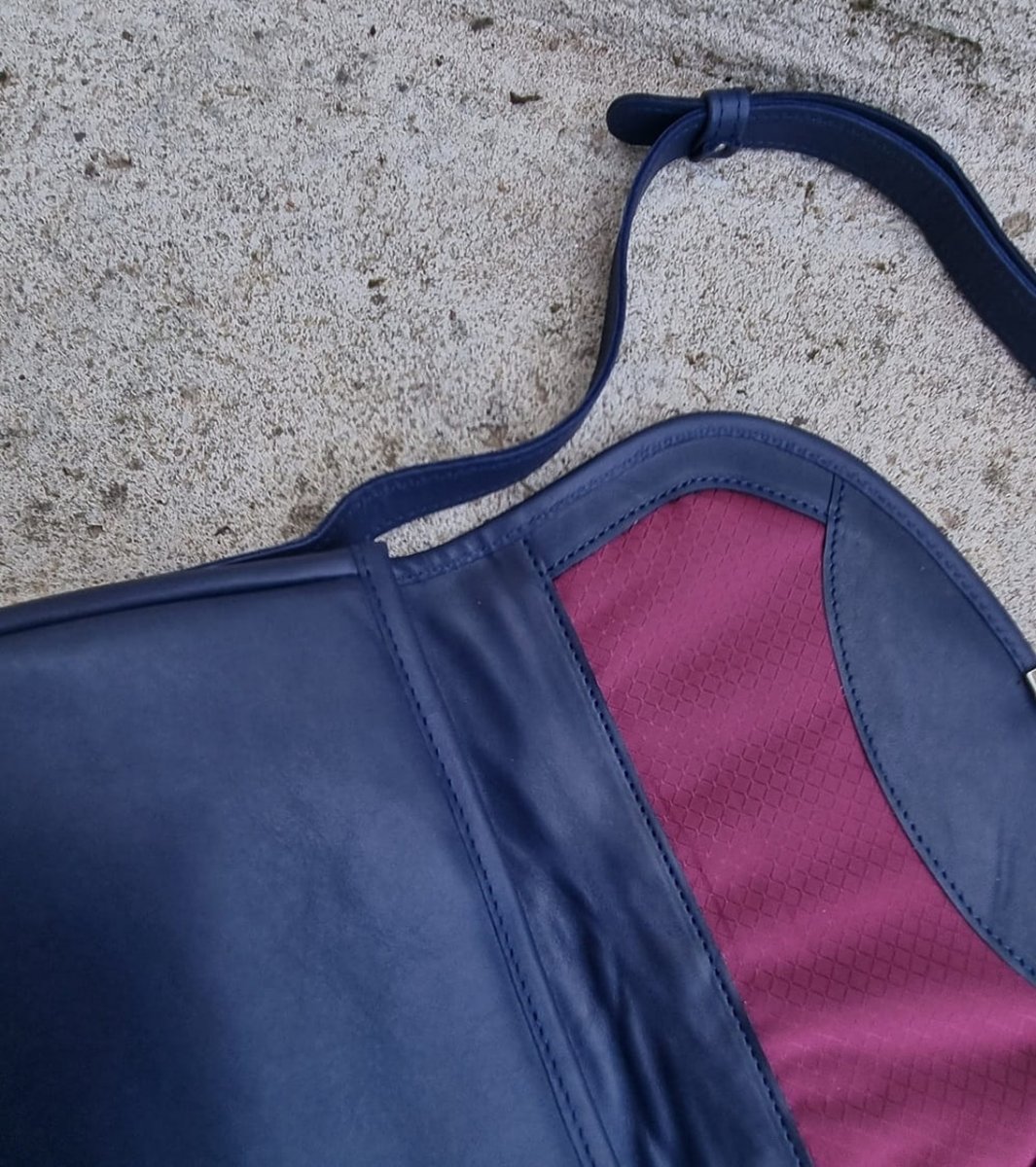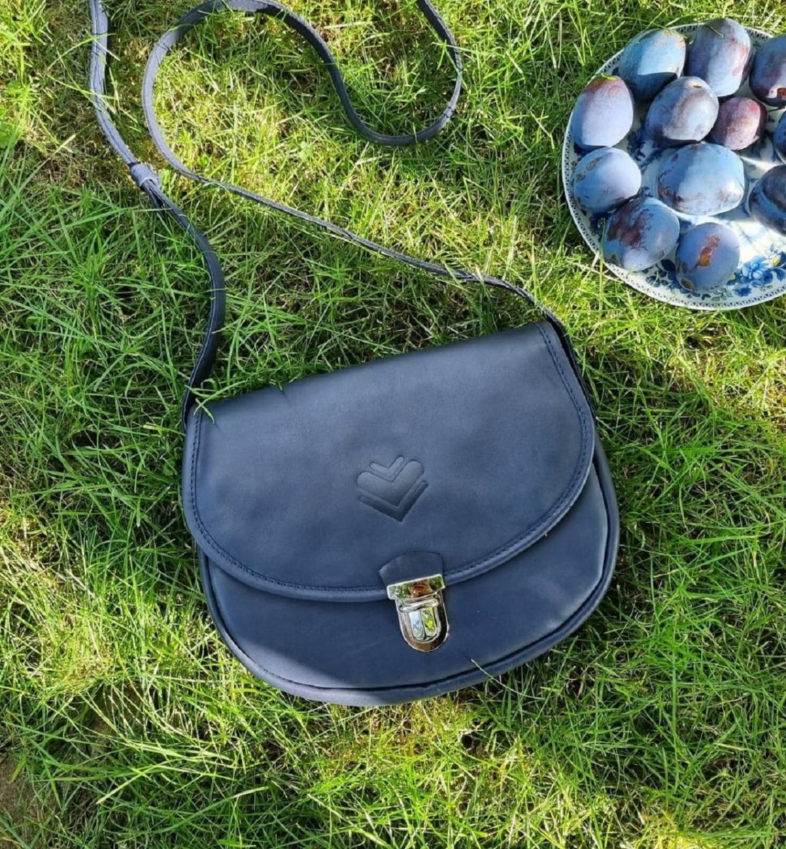 Je vyrobená z tmavě modré hovězí kůže. Kvalita použité kůže z ní dělá nákup na mnoho let. Kabelka má jednoduchý a elegantní design, který se hodí ke všem příležitostem. Uvnitř je prostor pro osobní věci, jako jsou mobilní telefon, peněženka a klíče.